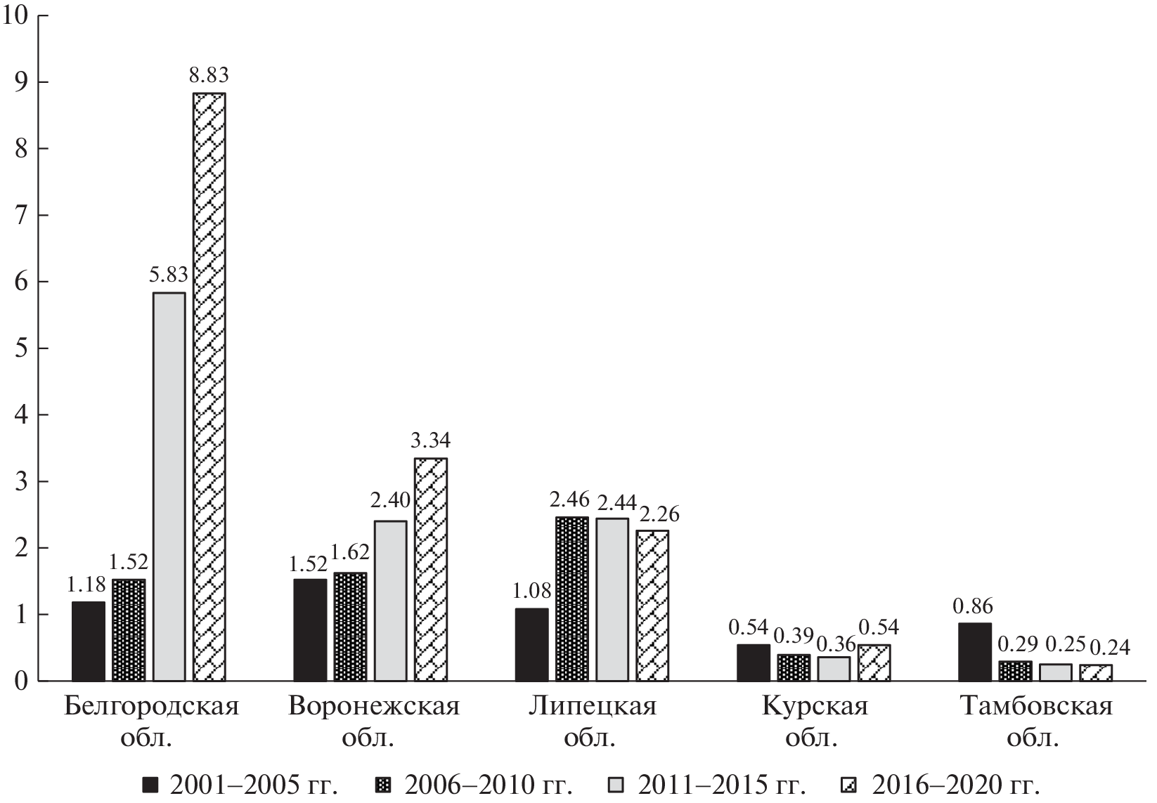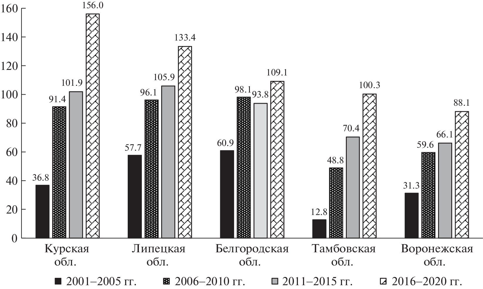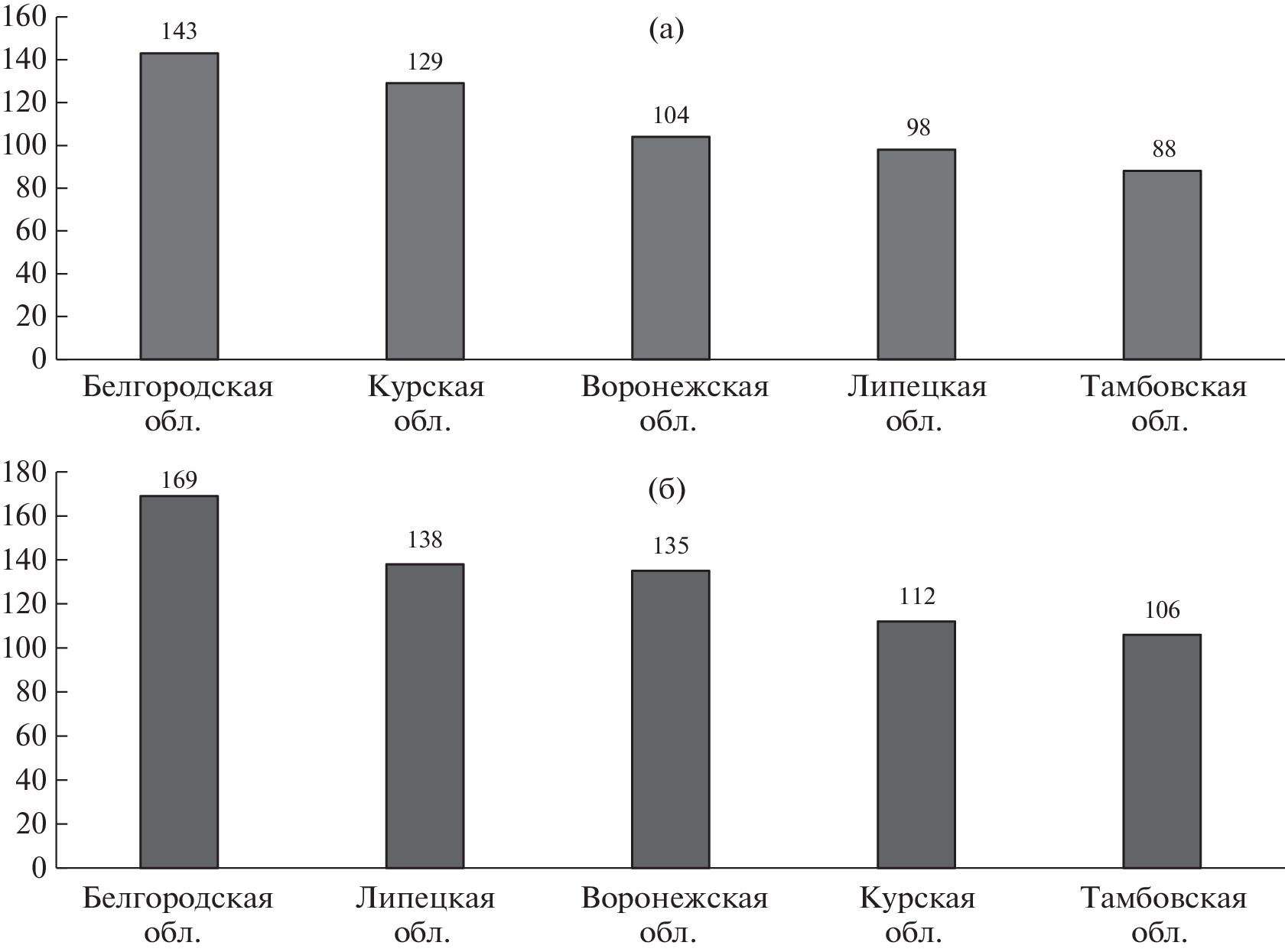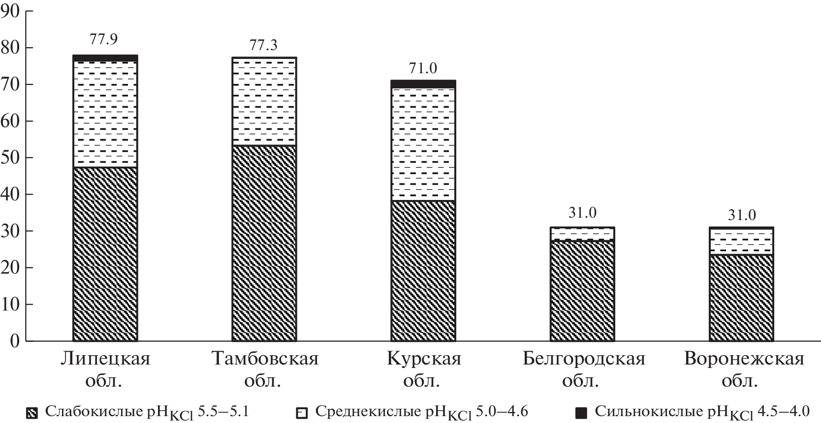 Based on the analysis of the results of agroecological monitoring, it was found that in the Central Chernozem region (CCR) for 2016–2020, compared with 2001–2005, there was a significant increase in the use of mineral fertilizers (1.8–7.8 times) and the volume of chemical soil reclamation (2.3–43.9 times). The highest level of application of mineral fertilizers (156 kg/ha) was achieved in the Kursk region, organic fertilizers (8.83 t/ha) and liming of acidic soils (65.9 thousand hectares per year) – in the Belgorod region. The minimum level of mineral fertilizers (88.1 kg/ha) and liming (13.0 thousand ha) was registered in Voronezh, and the use of organic fertilizers (0.24 t/ha) – in the Tambov regions. Over the same years, the yield of grain and leguminous crops increased by 1.51–2.19 times. The maximum yield was achieved in Kursk (4.95 t/ha) and Belgorod (4.87 t/ha) regions, the minimum – in Tambov (3.67 t/ha) and Voronezh (3.62 t/ha). As of 01.01.2021, the most significant increase in the provision of soils with organic matter, mobile forms of P2O5 and K2O, a decrease in the proportion of acidic soils was noted in the Belgorod region. In arable soils of the Tambov region the maximum weighted average content of organic matter (6.5%) was recorded, the minimum (4.7%) was noted in the Kursk region. The highest content of mobile forms of P2O5 (143 mg/kg) and K2O (169 mg/kg) was observed in the soils of Belgorod, the lowest (respectively 88 and 106 mg/kg) – in the Tambov regions. The highest proportion of acidic soils (77.9%) was recorded in the soils of arable land in the Lipetsk region, while in the Belgorod and Voronezh regions it was 31.0%. Arable soils of the region are mainly characterized by low availability of mobile forms of zinc, copper and cobalt. The highest proportion of soils with low availability of mobile forms of sulfur (95.1%) and manganese (88.3%) was noted in the Tambov region, the lowest – respectively in the Voronezh (74.7%) and Lipetsk (3.1%) regions.