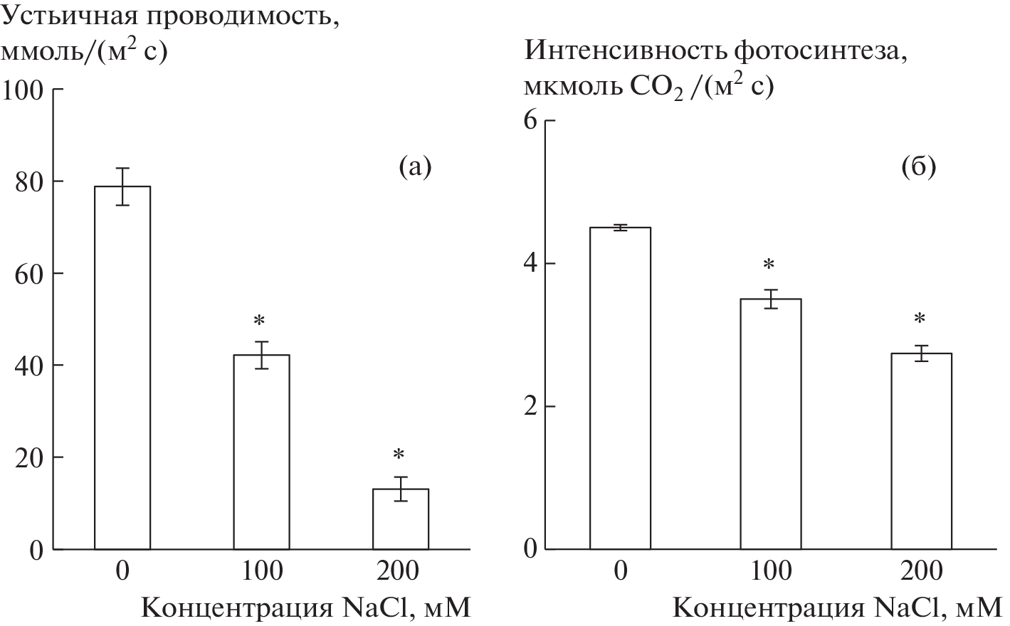 The influence of moderate and strong chloride salinity on seedlings of barley (Hordeum vulgare L.) Nur variety was studied under controlled environment conditions. Exposure of seedlings to both moderate (100 mM) and high concentrations (200 mM) of NaCl for 7 days led to a slowdown in the growth of their roots and shoots. At the same time, in the variant using NaCl in moderate concentration, an increase in the content of pigments was noted in the leaves of seedlings (chlorophylls and carotenoids by 25 and 22%, respectively). Also the photosynthesis rate decreased by 25% (relative to the control). In contrast, under the influence of a high concentration of NaCl, the content of pigments, as well as stomatal conductance, decreased markedly, which was accompanied by an almost twofold slowdown in the rate of photosynthesis. At the same time, transpiration was inhibited and tissue hydration decreased. It was concluded that the resistance of barley to NaCl can be judged already in the early phases of plant development. It is also noted that the most sensitive to the presence of NaCl in the root environment are easily recorded morpho-physiological indicators – the linear size of the shoot and its raw biomass.