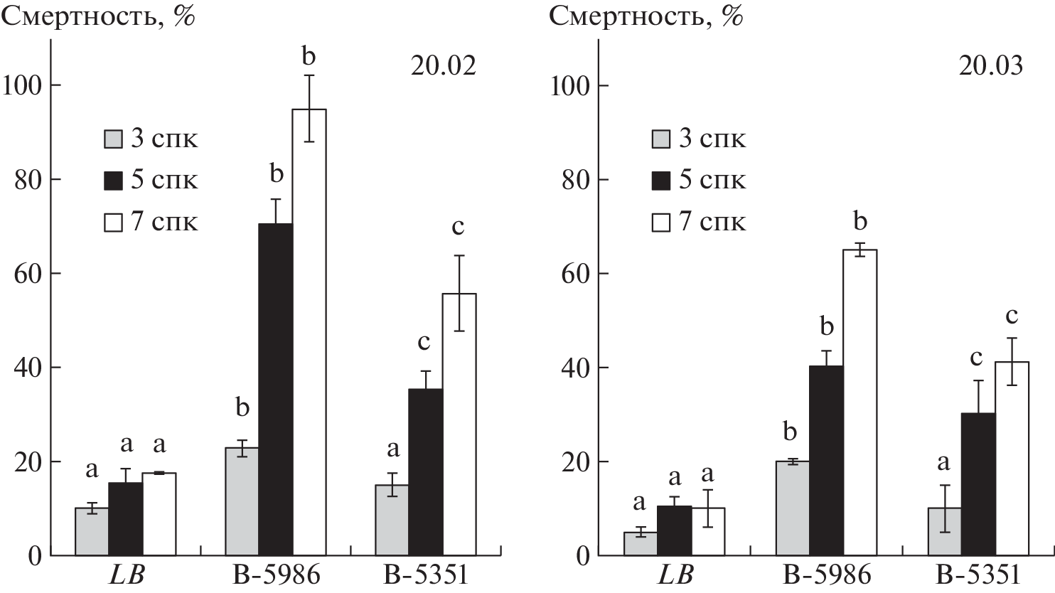 Currently, the search for B. thuringiensis strains to be used as biological control agents is based on their toxicity to insects in laboratory tests. At the same time, a number of strains of these bacteria are able to exist in symbiotic relationships with host plants, including being endophytes. The ability of B. thuringiensis strains to penetrate into the internal tissues of plants was evaluated by counting colony-forming units (CFU) of microorganisms 7 days after inoculation of sterile potato plants in test tubes; insecticidal activity was tested on larvae of the 3rd age obtained from overwintered adults of the Colorado beetle collected from fields in the Chishminsky and Iglinsky districts of Bashkortostan. It was shown that the strain of B. thuringiensis B-5351, which inhabits the surface (50.01 ± 8.10 CFU × 105/g) and internal tissues (38.92 ± 9.62 CFU × 105/g) of plant shoots, but has less insecticidal activity than the strain B. thuringiensis B-5689, which exhibits high insecticidal activity and colonizes mainly plant roots (25.37 ± 3.82 CFU × 105/g), reduced colonization of potato crops by the Colorado potato beetle, and also increased the yield of tubers in a 2-year experiment (2020–2021). Under the influence of B. thuringiensis B-5351, a decrease in the number of larvae of early age was observed, in contrast to B. thuringiensis B-5689, which caused longer metamorphosis processes. Apparently, the effect of B. thuringiensis B-5351 was the death of insects. It is important that processing B. thuringiensis B-5351 contributed to a significant decrease in the number of late-instar larvae on crops treated with this strain, as well as the degree of defoliation of plants by the pest, which was not observed with the action of B. thuringiensis B-5689. On plots treated with B. thuringiensis B-5351, the yield of commercial tubers and the total yield increased. A method is proposed for studying the endophytic potential of strains in relation to the terrestrial part of plants to search for biocontrol agents as a basis for creating algorithms for constructing microbiomes in agrocenoses.
