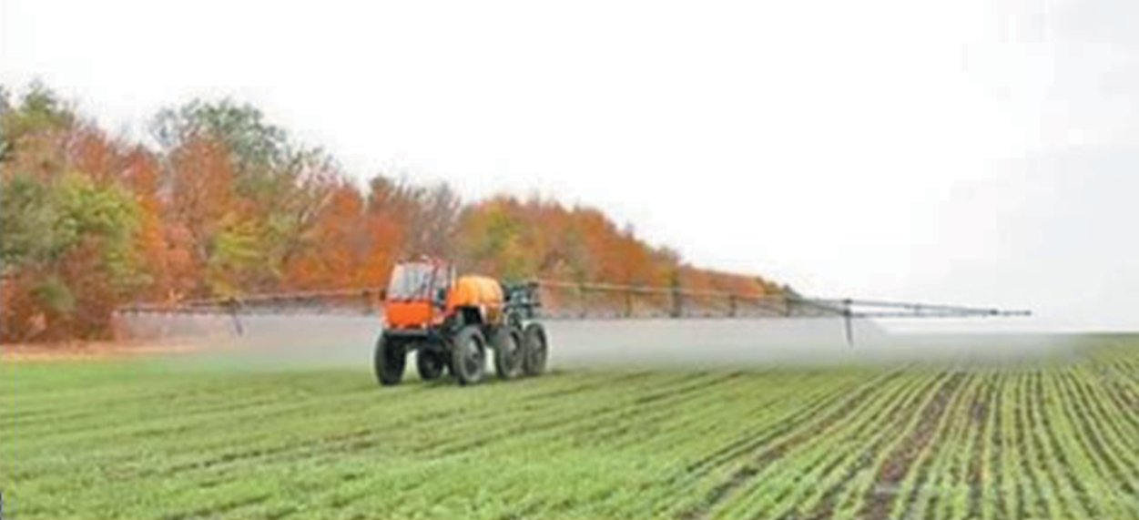 The design of the device for a hinged rod sprayer of plants for edge processing of the field by the main method of spraying of litter and pests is proposed. The average number of droplets deposited on the surface per 1 cm2 at a distance of up to 15 m meets the agrotechnical requirements for the use of herbicides, as well as insecticides and fungicides. According to the height of the cards at a distance of 10 m from the nozzle, the number of drops per 1 cm2 decreased, and especially with an increase in the height of their location from 69.7 to 17.5 and 31.7 pcs/cm2. At a distance of 15 m from the nozzle, the droplets were small and practically did not settle on the cards. When the vehicle is moving 7.2 km/h (2.0 m/s), the total mass flow of the working fluid of 2 slot sprayers LU-04.AD-04 (color code – red) and 2 slot sprayers LU-02.AD-02, (color code – yellow) at a pressure of 4 The bar was 45.5 g/m linear. It took 45.5 liters of working fluid to work 1 km of the forest belt. For example, a capacity of 600 liters is sufficient for edge processing along the perimeter of a field with a length of 13.2 km. The developed technical means will ensure the effective treatment of protective forest plantations from weeds and pests.