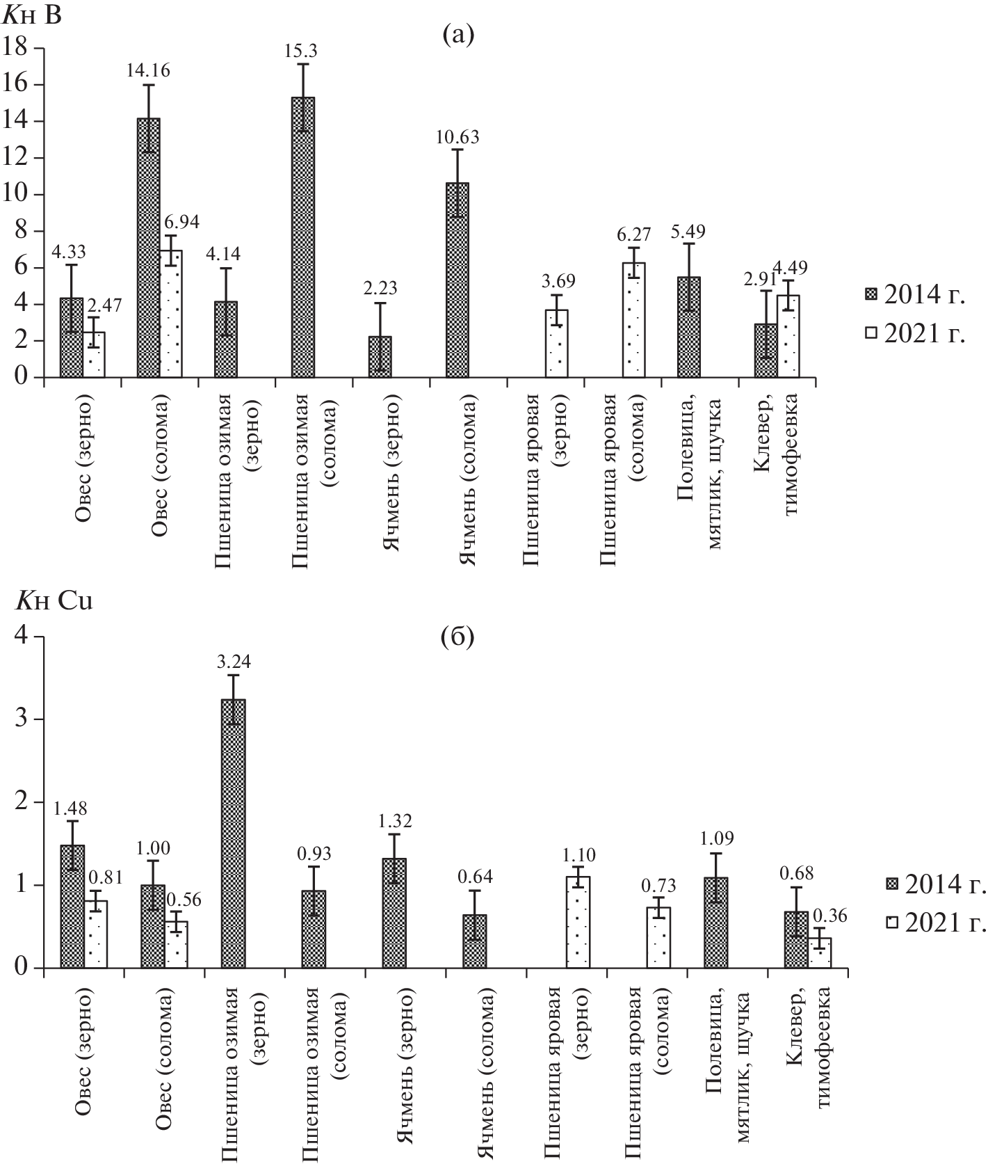 The paper presents the results of a survey of sod-podzolic soils for agricultural purposes and plants of reference sites of the Ivanovo region for the content of boron, copper, cobalt, manganese and zinc in them, conducted in 2014 and 2021. Correlation analysis determined the influence of individual physical and chemical properties of soils on the content and distribution of available forms of trace elements in the soil and the relationship between the trace elements themselves. Changes in the availability of trace elements of the soils of the plots have been established. According to the amount of content of available forms of trace elements in soils, the need for the use of micronutrients is determined. The sequences of crops were determined by the content of trace elements in grain and straw of cereals, the green mass of forage grasses, as well as the distribution of trace elements between parts of the grown crop. Grain, straw and green mass were evaluated for compliance with veterinary standards for the content of copper, zinc and cobalt in feed. The coefficients of accumulation of trace elements by plant products of crops are calculated and their comparative analysis is carried out. By the magnitude and sign of the correlation coefficients between the concentrations of trace elements in plants, the manifestation of antagonism and synergy between trace elements was determined. The Pearson and Spearman correlation coefficients between the content of mobile forms of trace elements in the soil and their content in plant products, as well as between the content of trace elements in grain and straw of cereals revealed their strength and the ambiguous nature of the relationships..