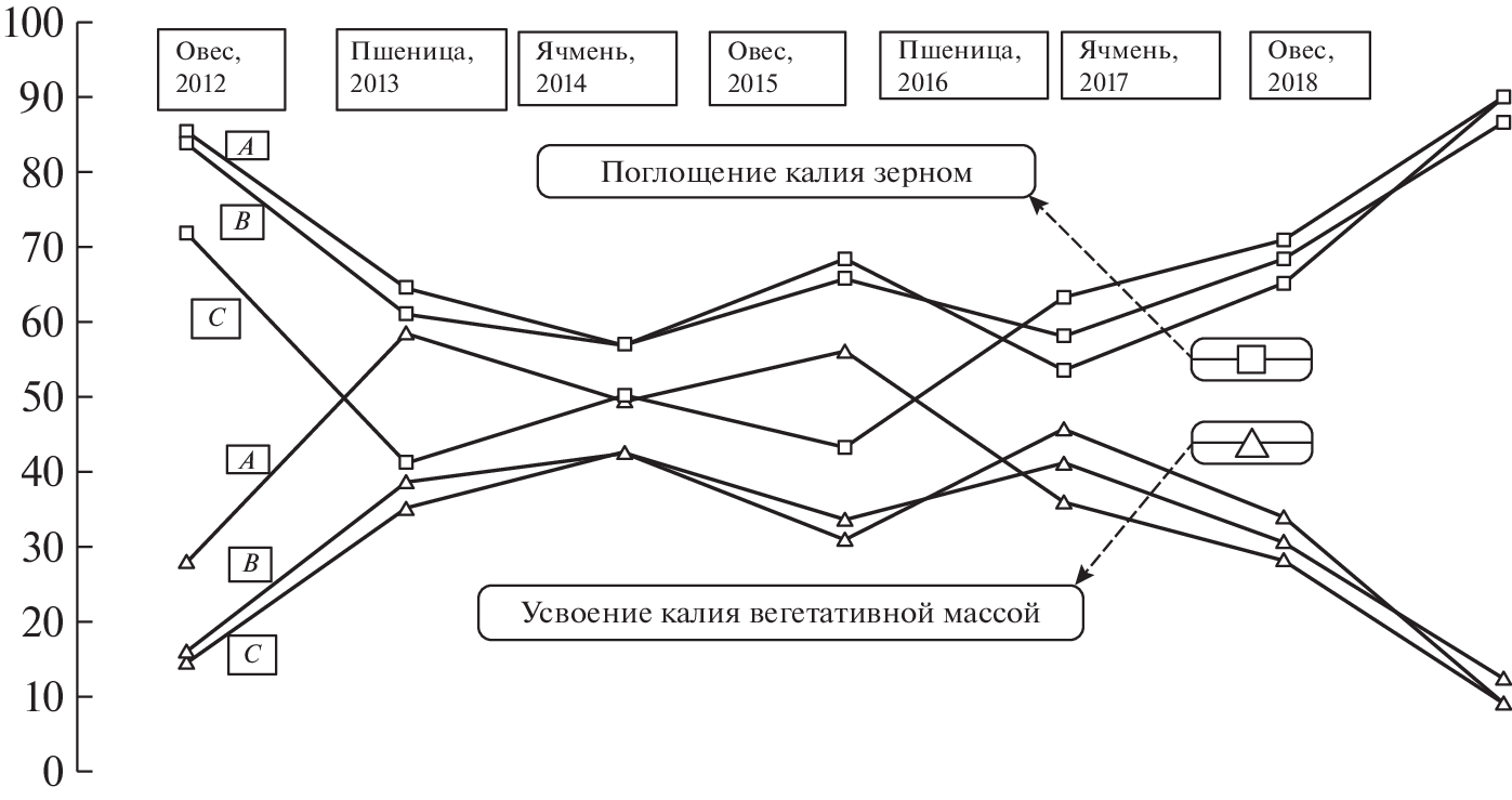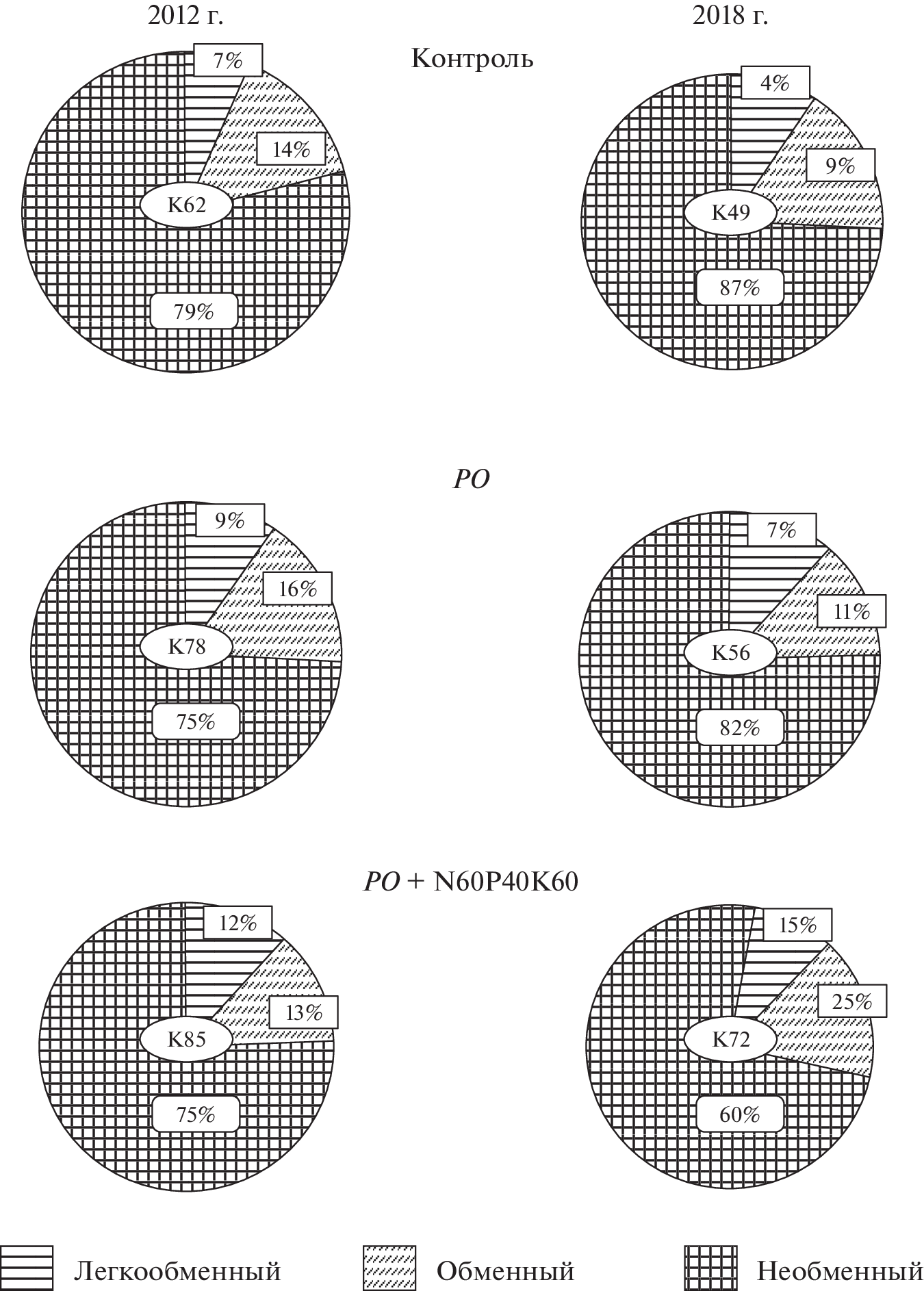В микрополевых опытах, проведенных на серой лесной почве, изучены изменения форм калия под влиянием внесения минеральных удобрений и растительных остатков. Показано, что почвенный калий, содержащийся в водорастворимой и легкообменной форме, изменялся в широких пределах. В условиях 2012 г. при внесении K60 на фоне азота и фосфора по сравнению с контролем возросло содержание водорастворимого калия примерно в 2, легкообменного – в 4 раза. В случае заделки растительных остатков в почву содержание калия в водорастворимой форме повысилось в 2 раза, легкообменной – в 2.5 раза соответственно. Содержание обменного калия изменялось в вариантах мало, изменения затрагивали в большей степени необменную форму. В частности, содержание необменного калия в 2018 г. по сравнению с 2012 г. снизилось в 1.5–2.0 раза, что потребовало создания более надежной основы для получения объективной информации о состоянии калийного фонда почв лесостепной зоны. Под влиянием K-удобрений в сочетании с растительными остатками стабилизировалась продуктивность растений, и при этом складывался положительный баланс калия в почве.