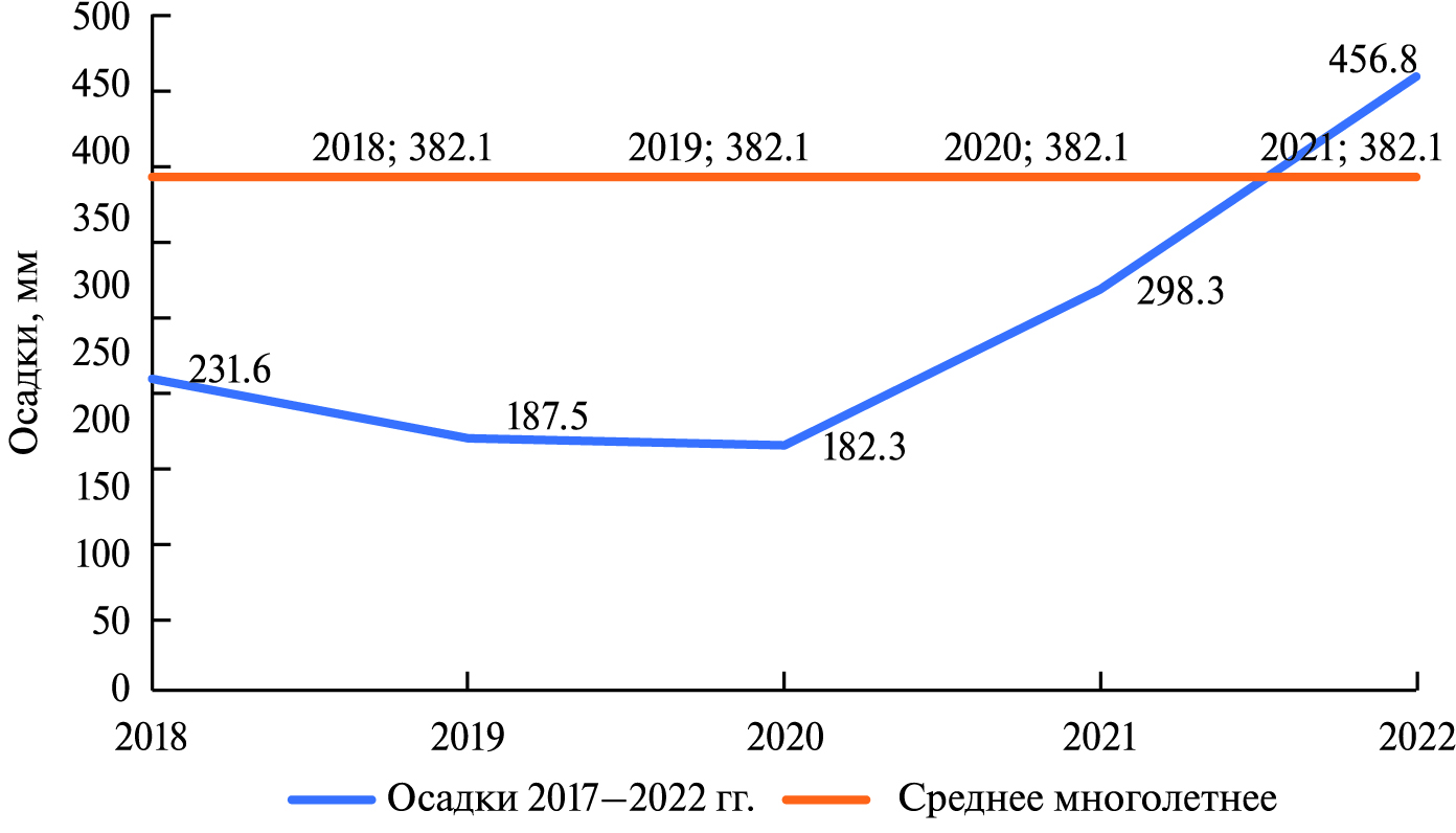 Рис. 1. Уровень увлажнения в 2018–2022 гг., мм