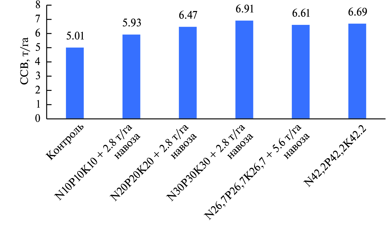 Максимальный сбор сухого вещества с 1 га севооборотной площади обеспечивался применением системы N30P30K30 + навоз 2.8 т/га (6.91 т/га), минимальный – системы N10P10K10 + навоз 2.8 т/га (5.93 т/га), повышение относительно контроля составило 20.4–37.9%. Последовательное увеличение удобренности в наибольшей степени повышало ССВ в варианте N10P10K10 + навоз 2.8 т/га на 8.99 и 6.87% соответственно относительно меньших доз, доза N26.7P26.7K26.7 + навоз 5.6 т/га снижала ССВ на 4.34%, доза N42.2P42.2K42.2 – незначительно увеличивала.
