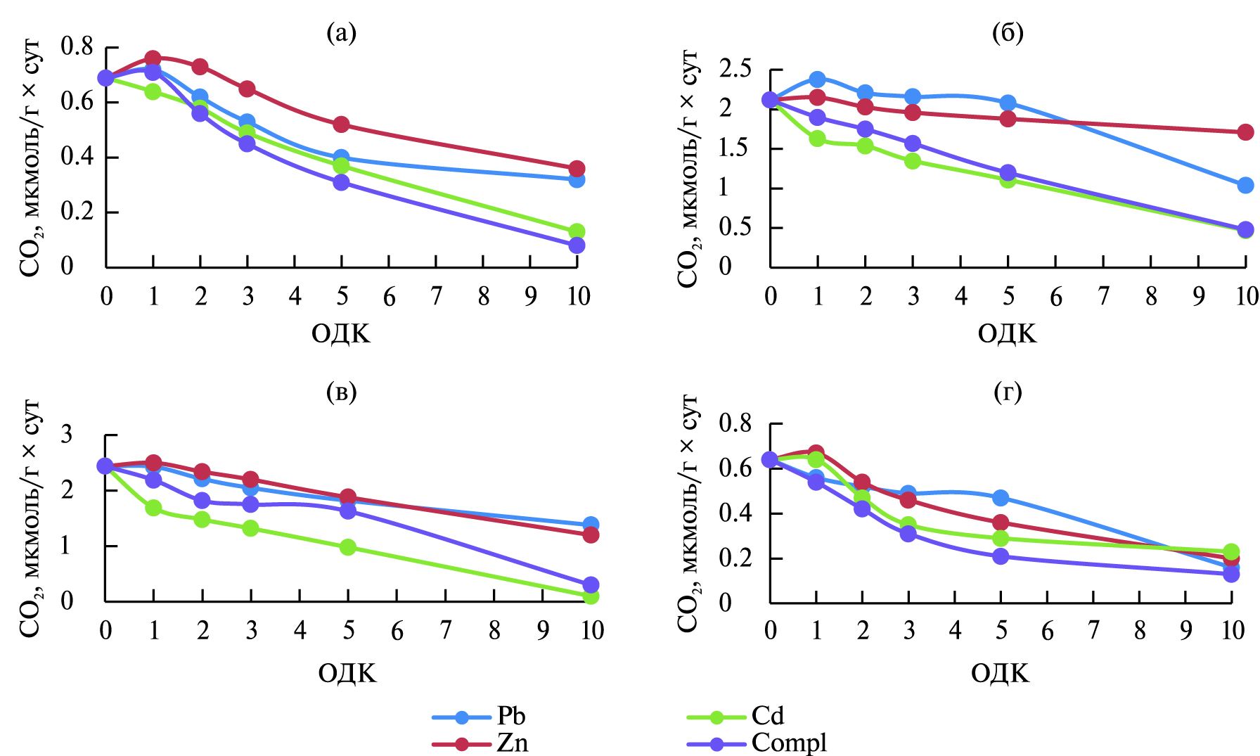 Рис. 1. Интенсивность эмиссии СО2 при различном содержании тяжелых металлов в дерново-подзолистой почве (а) серой лесной (б), черноземе выщелоченном (в) и каштановой (г) почвах.