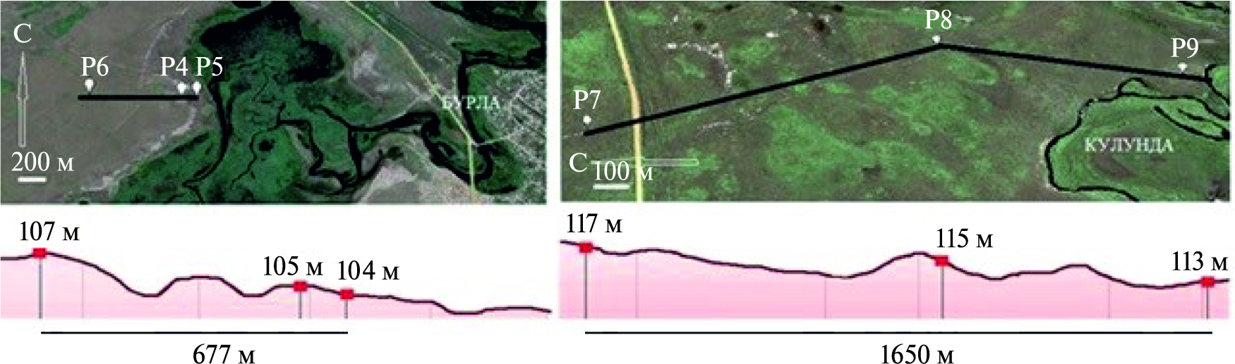 Рис. 2. Геоморфологические профили участков исследования (слева – долина р. Бурла, справа – долина р. Кулунда)