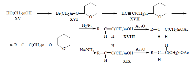 Комплекс ацетиленида лития с этилендиамином конденсировали в ТГФ, ГМФТ, ГМФТ/ТГФ с соответствующим тетрагидропиранилоксиалкил бромидом (XV) для получения с почти количественным выходом ключевого соединения – дизамещенного ацетилена (XVII), которое далее гидрировали над катализатором Линдлара и получали продукт, содержащий более 95% цис-изомера (XVIII). Соответсвующие транс-изомеры (XIX) были получены при восстановлении литием в жидком аммиаке.