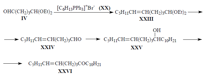 Реакцией моноацеталя (IV) с фосфораном, генерированным из фосфонийной соли (ХХ) в условиях цис-олефинирования с выходом 84%, получен диэтилацеталь цис-5-ундецаналя (XXIII), кислотный гидролиз которого приводил с выходом 77% к цис-5-ундеценалю (XXV). Альдегид (XXIV) с магнийбромдецилом с умеренным выходом давал непредельный спирт (XVIII), окисленный хлорхроматомпиридином в конечный кетон (XXV). Общий выход кетона, исходя из моноацеталя, составлял 28.7%: