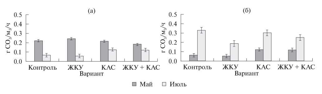 Рис. 2. Эмиссия CO2 при внесении удобрений под бобовые культуры: (а) – горох, (б) – нут