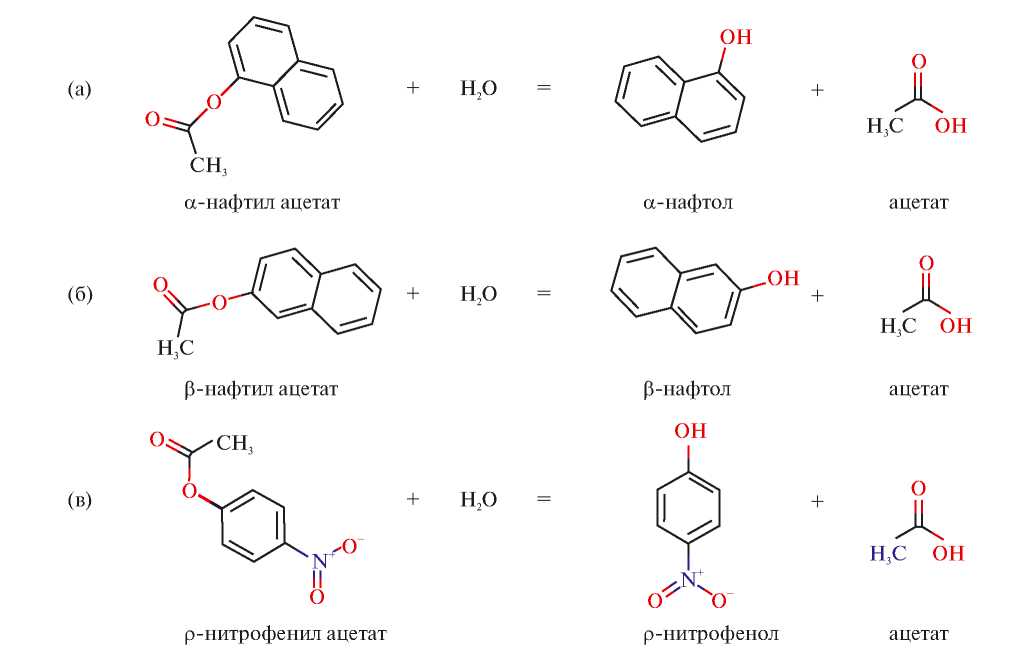 Рис. 1. Гидролиз карбоксилэстеразами различных субстратов: (а) – α-нафтил ацетат (α-NA), (б) – β-нафтил ацетат (β-NA), (в) – ρ-нитрофенил ацетат (ρ-NPA) [17]