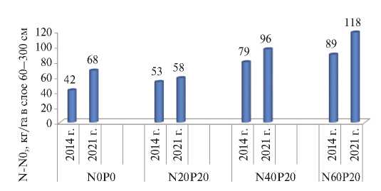 Отмечено, что за 7 лет значительно возросло количество нитратного азота в 3-метровом слое, особенно при дозе N60Р20. За эти годы в теплое время года (май–сентябрь) выпало в сумме 1470 мм осадков, в среднем за год – 210 мм. Во 2-й и 3-й метры профиля почвы попало 60% нитратного азота в 2014 г. и 42% – в 2021 г. в контроле, на фоне внесения N40Р20–45 и 37 и N60Р20–59 и 45%.