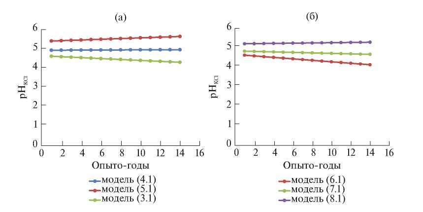 Модель (4), описывающая изменение pHKCl в варианте с частицами доломита размером 5–7 мм в дозе 3 Нг в течение 14 опыто-лет, статистически не значима (табл. 2). Статистически значимых изменений pHKCl во всем промежутке времени эксперимента не выявлено. График модели приведен на рис. 1а.