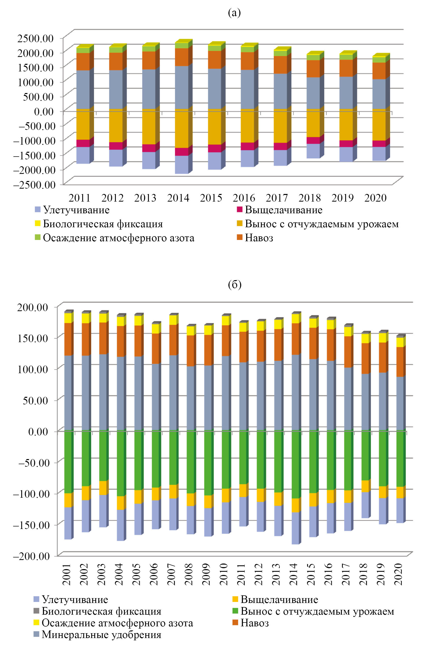 Рис. 1. Баланс азота в земледелии Германии: (а) – тыс. т/год, (б) – на единицу площади, кг/га.
