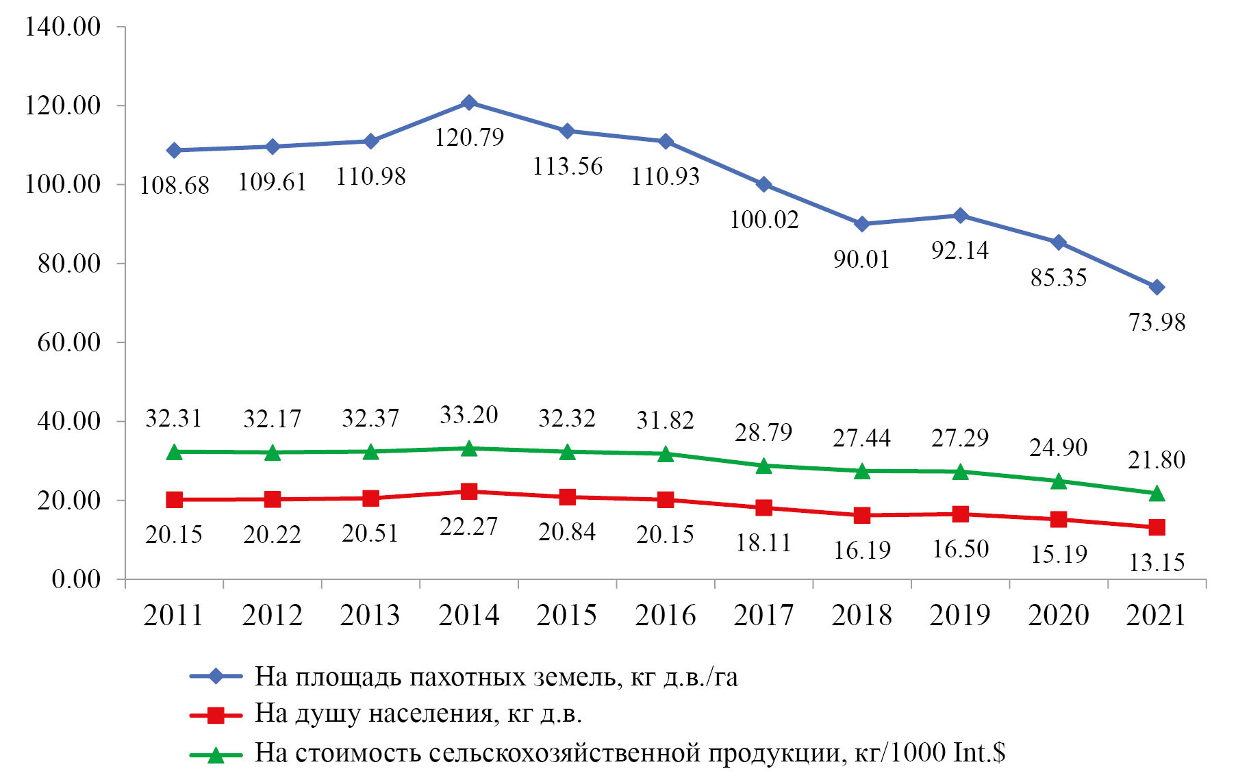 Начиная с 2015 г., можно было наблюдать нисходящий тренд применения азотных минеральных удобрений на пахотных угодьях, который в период 2014–2021 гг. составил – 5.94%. Данный факт связан с проводимой в стране политикой по сокращению применения удобрений с целью снижения негативного действия химикатов, в данном случае нитратов, на окружающую среду и человека.