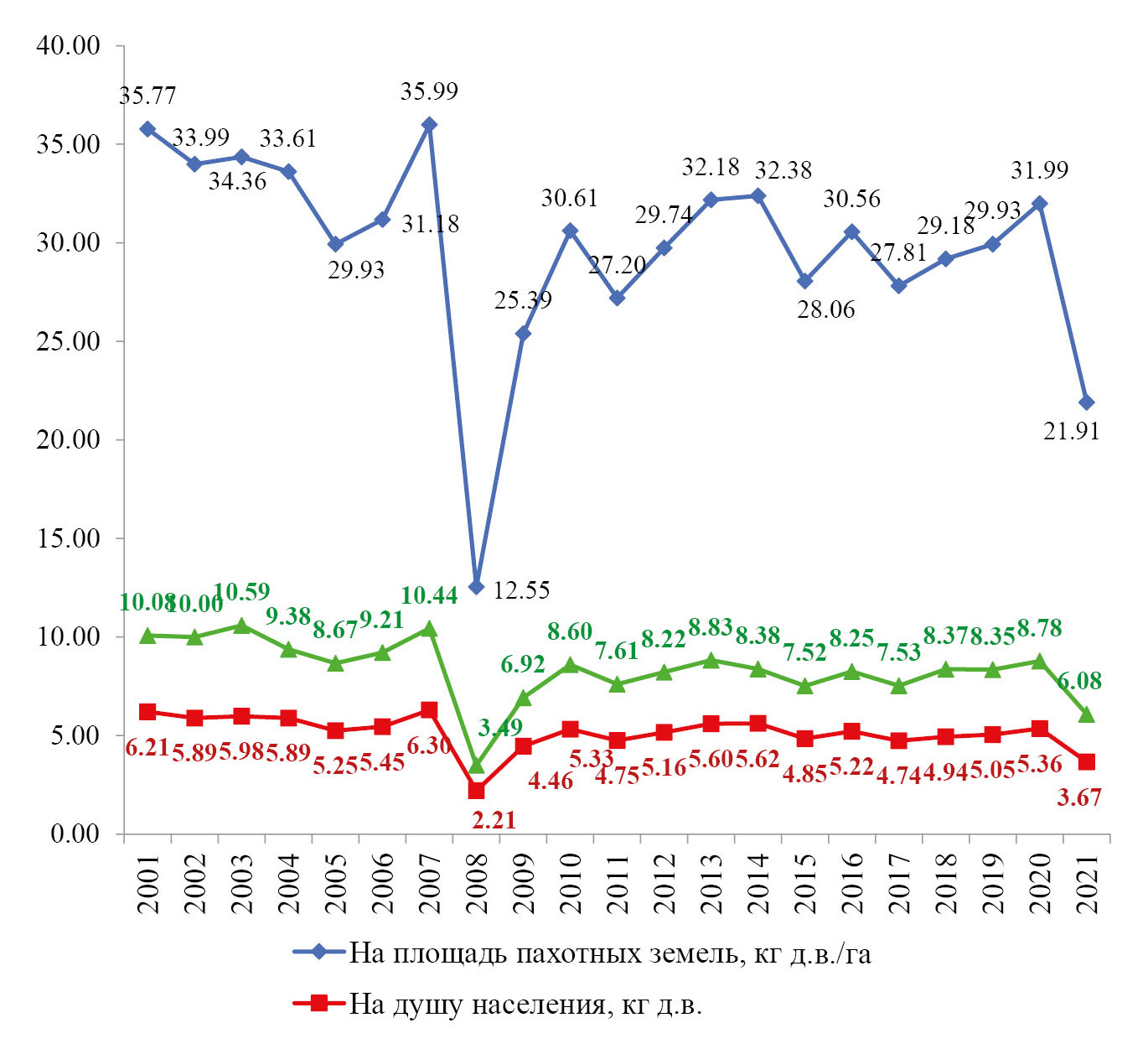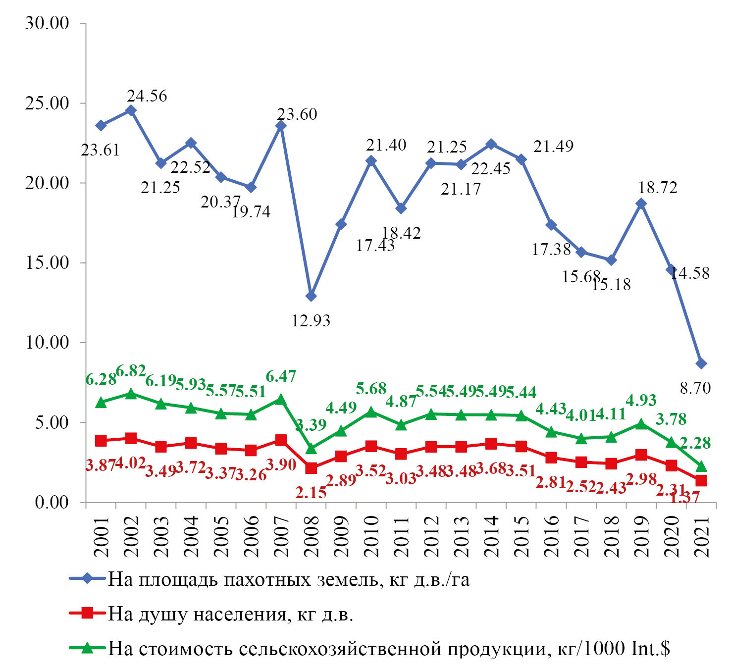 Также по данным, представленным на рис. 4, можно сделать вывод о тенденции к снижению объемов применения фосфорных минеральных удобрений. В 2021 г. в пахотные земли вносили 8.7 кг д. в./га, что на 63.2% меньше, чем в 2001 г., уменьшение в период 2001–2021 гг. составило – 4.64%. Это способствовало снижению применения Р2О5 на душу населения на 64.6% – с 3.87 до 1.37 кг д. в./человека, на стоимость сельскохозяйственной продукции – с 6.28 до 2.28 кг/1000 Int.$ (на 63.7%).