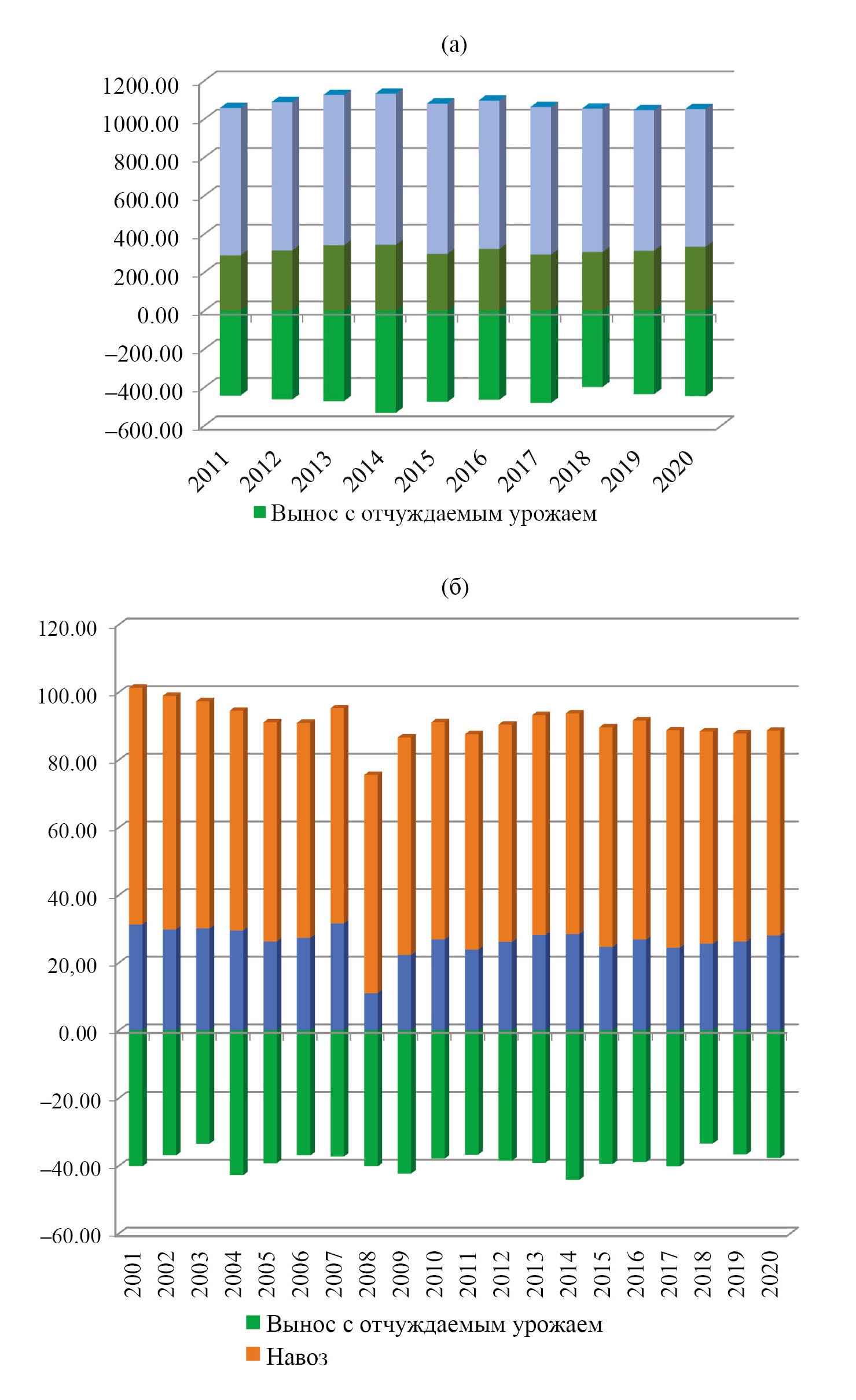 Однако в условиях мирового экономического кризиса в стране было сокращено применение минеральных удобрений, в связи с чем этот показатель начал снижаться, минимальным он был в 2008 г. – 0.18 кг/га. В 2010 г. применение фосфорных минеральных удобрений вернулось на уровень 2001–2007 гг., ввиду чего баланс элемента достиг +5.3 кг/га. В период 2011–2020 гг. показатель стабилизировался на уровне +4.1 кг/га.