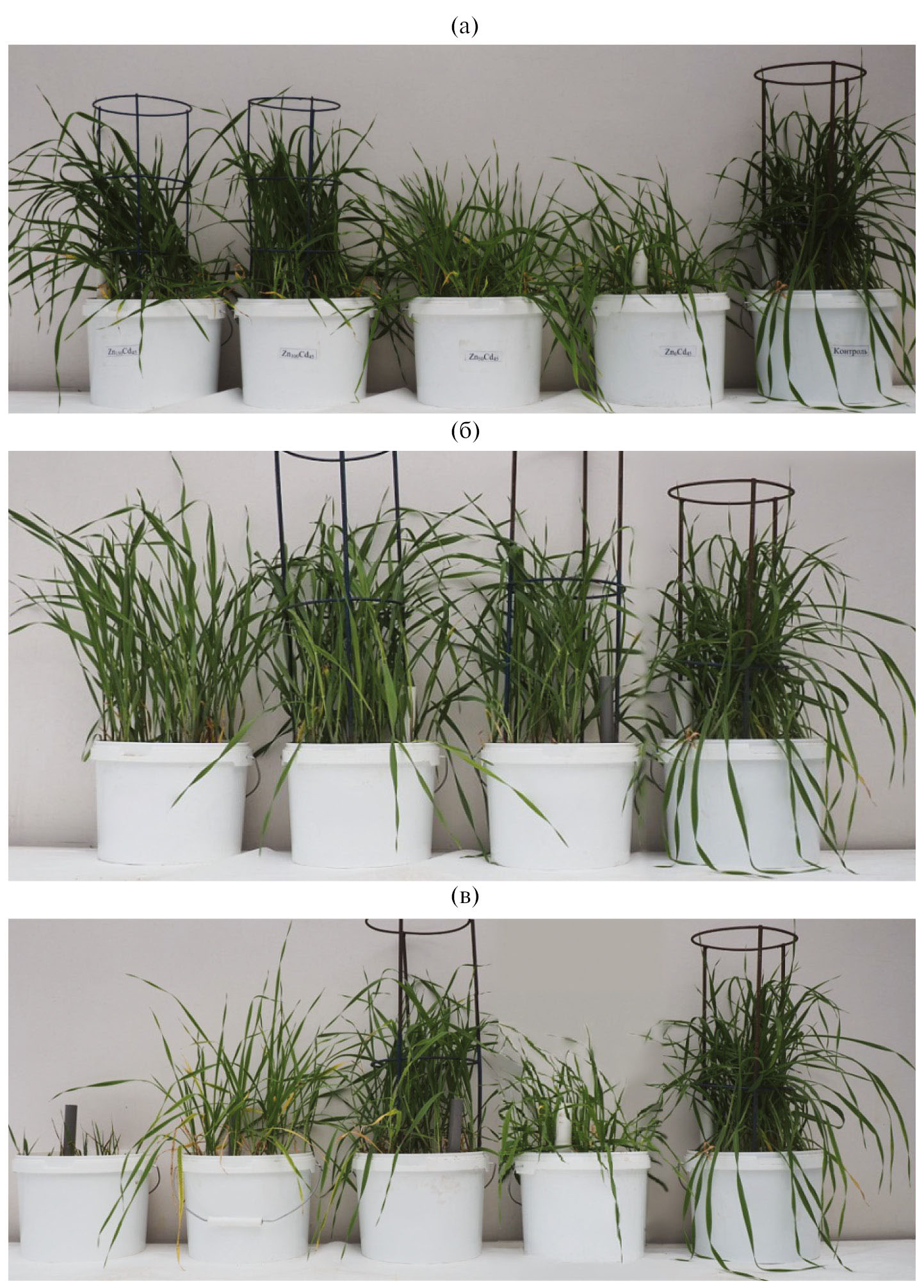 Рис. 1. Внешний вид растений ячменя сорта Зазерский 85 на 30-е сут выращивания (слева направо (а) – варианты Zn150Cd45, Zn100Cd45, Zn50Cd45, Zn0Cd45, контроль; (б) – варианты Cu200Cd25, Cu100Cd25, Cu50Cd25, контроль; (в) – варианты Cu200Cd45, Cu100Cd45, Cu50Cd45, Cu0Cd45, контроль).