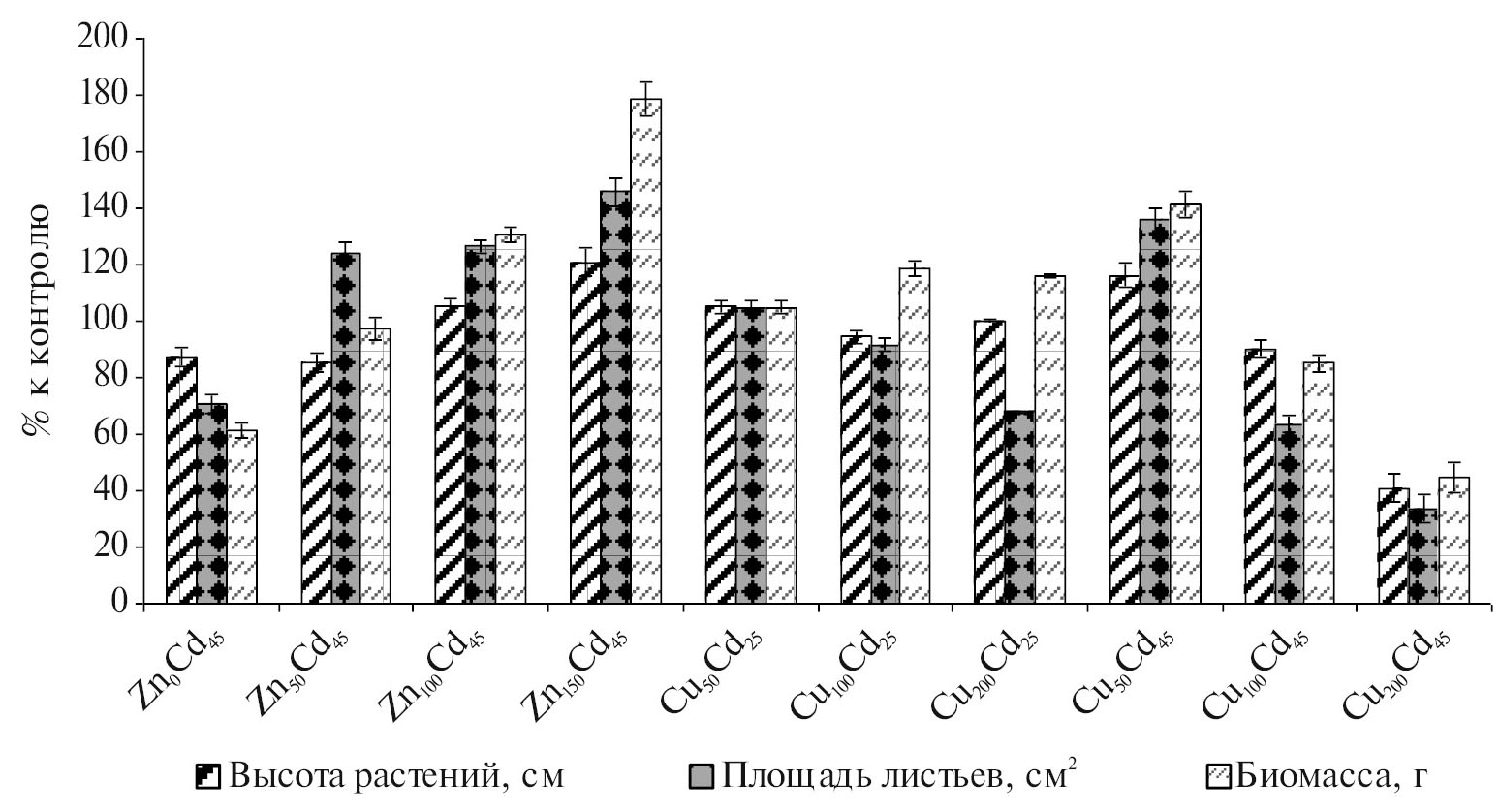Куда более интересные данные удалось получить при совместном внесении дозы кадмия 45 мг/кг и различных доз меди. Минимальная доза меди (50 мг/кг) позволяла устранить воздействие токсического стресса и способствовала стимуляции развития растений. Изученные три морфометрических показателя возрастали на 116–141%. Однако по мере увеличения дозы меди эффект стимуляции роста постепенно исчезал, и снова развивался токсический стресс. Например, при внесении меди в дозе 100 мг/кг высота растений и биомасса сокращались до примерно контрольного уровня, а площадь листьев уменьшилась более значительно, до 63% от контроля. При максимальной дозе меди наступало полное угнетение роста и развития растений, довольно много семян даже не проросли, другие растения погибали на стадии кущения. В целом морфометрические показатели уменьшились при этом до 44–33% от контроля.