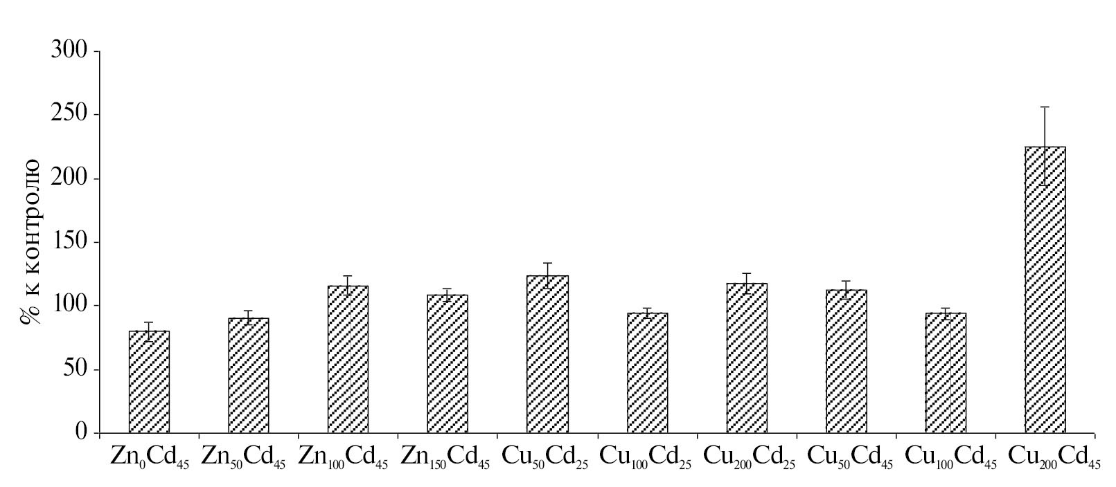 В то же время при внесении в почву кадмия в концентрации 45 мг/кг медь иным образом взаимодействовала с этим поллютантом. При минимальной дозе меди (50 мг/кг) уровень токсического стресса снижался почти до контрольного уровня, но при дальнейшем возрастании дозы меди состояние растений ухудшалось. При внесении дозы 100 мг Cu/кг растения демонстрировали заметное угнетение, но все же могли еще продолжать рост и развитие, но при внесении 200 мг Cu/кг наблюдали полное угнетение растений.
