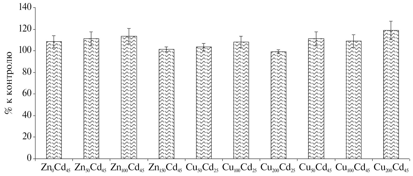 Иная тенденция отмечена для накопления цинка. В соломе цинк накапливался в значимо большем количестве, чем медь во всех вариантах с ней. Например, в варианте Cd45Zn50 в соломе содержание цинка было более чем в 8 раз больше контроля. По мере увеличения концентрации цинка его накопление в соломе тоже росло, но не существенно (в 10 раз больше по сравнению с контролем в обоих вариантах Cd45Zn100 и Cd45Zn150). В зерне при минимальной дозе цинк накапливался в очень низкой концентрации (в 0.38 раза больше контроля), по мере роста дозы цинка его накапливалось больше (примерно в 3 раза больше контроля как в варианте Cd45Zn100, так и в варианте Cd45Zn150). Следовательно, цинк демонстрировал тенденцию к накоплению в соломе, но не в зерне. Аналогично его внесение сказывалось и на накоплении кадмия.