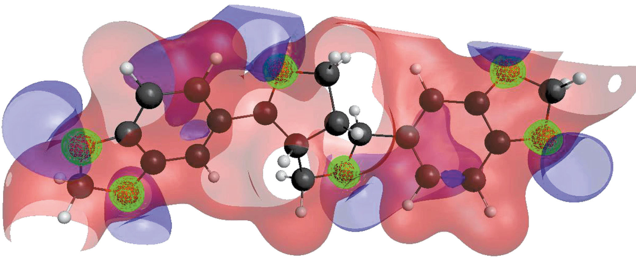 К сожалению, подходящих моделей оксигеназ, принадлежащих насекомым, в базе данных PDB нами обнаружено не было. Поэтому в качестве модельного фермента нами была выбрана цитохром Р450-зависимая монооксигеназа (идентификационный номер 3G1Q в базе PDB) – мембраносвязанный фермент, принадлежащий паразитическим простейшим (Trypanosoma brucei). Выбор данной модели определялся, во-первых, тем, что данный фермент катализирует окисление сложных эфиров, имеющих структурное сходство с пиретроидами. Во-вторых, описанные в литературе ингибиторы цитохромов структурно близки замещенным бензодиоксоланам – ВС, усиливающим действие пиретроидов. В-третьих, цитохром Р450-зависимая монооксигеназа является низкоспецифичным ферментом, окисляющим множество различных групп ксенобиотиков. Например, при значительной вариабельности аминокислотной последовательности в белковом матриксе активные центры цитохромов Р450, содержащие гем в качестве кофактора, а также использующие в процессе окисления субстрата универсальный кофермент никотинамидадениндинуклеотидфосфат (донор электронов – НАДФ), достаточно консервативны. Поэтому моделирование комплексов, включающих только активные центры ферментов и не затрагивающее всю аминокислотную последовательность, может достаточно удовлетворительно описать процессы взаимодействия лиганда с белком. Кроме того, моделирование процессов связывания лигандов с белками, основанное на квантово-химических расчетах соответствующих комплексов, требует больших вычислительных ресурсов и машинного времени. В этой связи замена расчетов комплекса лиганд–белок на расчеты, ограниченные взаимодействием лиганда только с активным центром, значительно упрощает задачу и уменьшает время расчетов. Методами компьютерного моделирования была проведена полная оптимизация молекул лигандов, входящих в уравнения построенных взаимодействий, решены термодинамические задачи, вычислены матрицы Гессе, получены данные распределения электронной плотности молекул, дипольных моментов, величины зарядов на атомах, вычислены полная валентность на каждом атоме и термодинамические потенциалы, а также построены теоретические ИК-спектры данных лигандов. В результате расчетов было установлено, что отрицательный электростатический потенциал (и основная часть электронной плотности) сосредоточен в основном вблизи атомов кислорода лигандов, а также в аксиальной области ароматического кольца бензодиоксолановых фрагментов. На остальной области пространства вокруг молекул лигандов преобладает положительный электростатический потенциал (рис. 1).