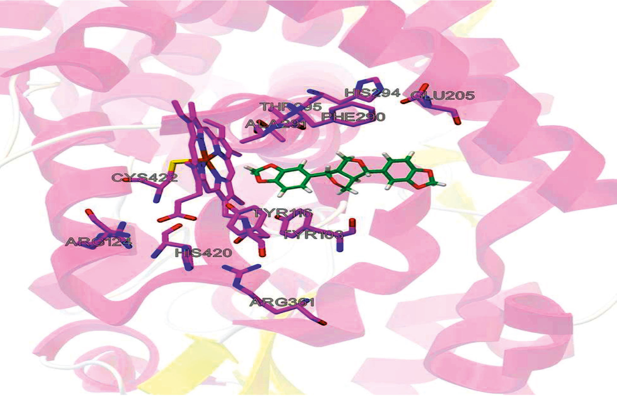 Рис. 2. Комплекс сезамина с цитохром Р450-зависимой монооксигеназой в активном центре фермента. Обозначены остатки аминокислот, взаимодействующие с лигандом, цифрами – номера аминокислот в белковом матриксе.