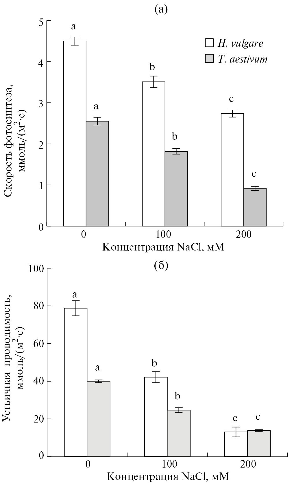 В нашем исследовании даже в условиях умеренного засоления (100 мМ) скорость фотосинтеза в проростках ячменя и пшеницы заметно снижалась, причем практически в равной мере (в 1.5 раза по отношению к контролю). Во многом это было связано с частичным закрытием устьиц, о чем свидетельствовало уменьшение устьичной проводимости, отмеченное у растений в этом варианте опыта. Вместе с тем, содержание фотосинтетических пигментов в проростках обоих видов злаков возрастало (по сравнению с контролем), но соотношение хлорофиллов (а/б) и их содержание в ССК при этом сохранялось на уровне контроля, что обеспечивало необходимый уровень светопоглощения.