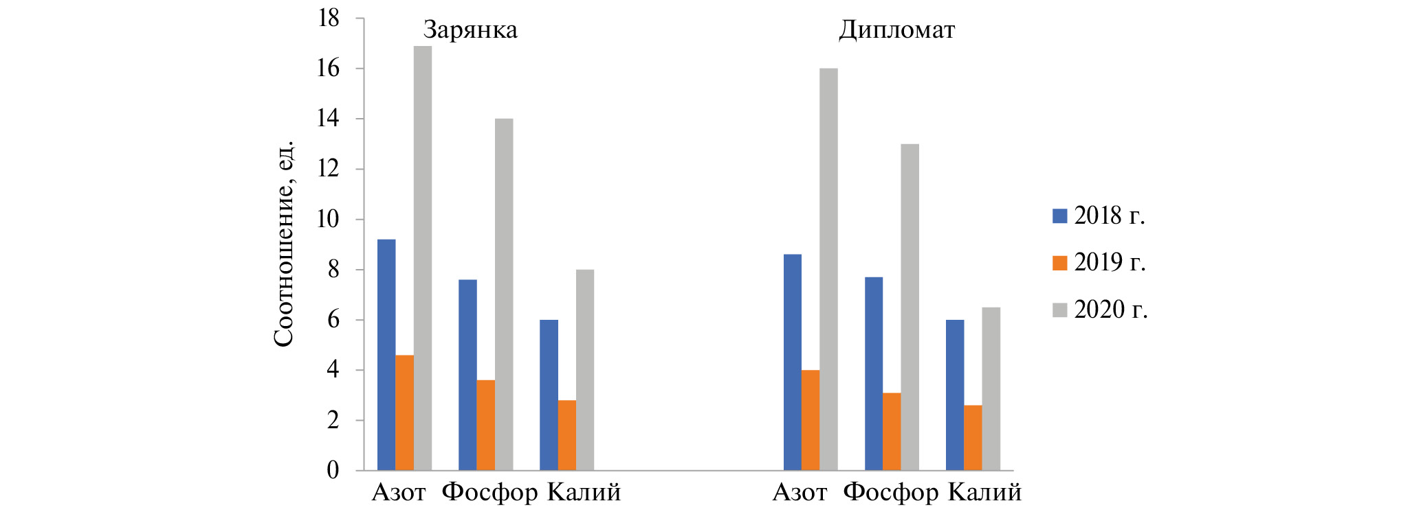 Перераспределение элементов из корня в стебель зависело от метеорологических условий периода вегетации и сорта. В 2020 г. элементы питания сразу переходили в стебель льна. Азота было в 16 раз больше в стебле, чем в корнях, фосфора – в 14 раз, калия – в 8 раз у сорта Зарянка. В 2019 г. соотношение содержания элементов в стебле и корне было минимальным (рис. 2).