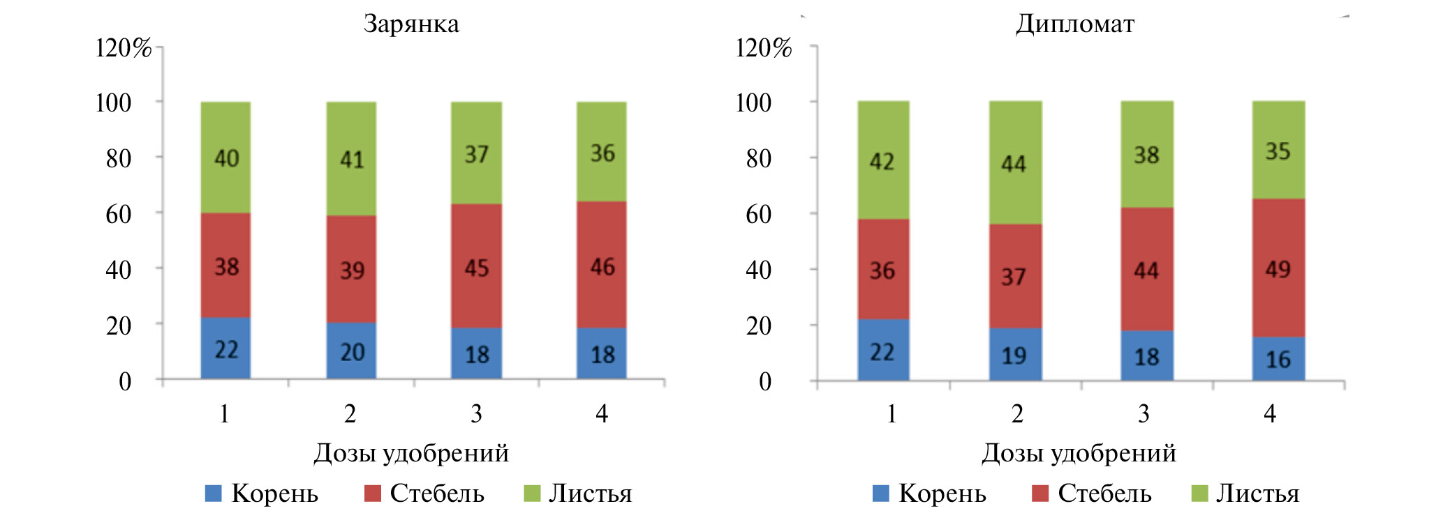 Дозы удобрений, рассчитанных разными способами, повлияли на формирование структуры растений льна. Без применения удобрений растения льна, стремясь получить питание, увеличивали долю корней и листьев в ущерб стеблей – основной продукции, ради которой возделывают лен-долгунец. Например, в фазе развития “быстрый рост” в варианте без применения удобрений доля корней и листьев в структуре растения была самой высокой – 22 и 40% (сорт Зарянка), 42% (сорт Дипломат) соответственно, а доля стеблей – самой низкой: 38% у сорта Зарянка и 36% у сорта Дипломат. Наибольшая доля стеблей у сорта Зарянка (45 и 46%) и у сорта Дипломат (44 и 49%) сформировалась при оптимизации питания за счет внесения удобрений в дозах N30P22K80 и N30P60K120 (рис. 3).