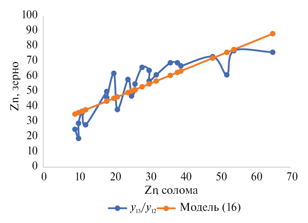 Модель (16) зависимости содержания Zn в зерне ячменя от содержания Zn в соломе имеет очень высокую статистическую значимость. модель носит линейный характер, несомненно, имеется очень сильная связь между содержанием цинка в зерне и соломе ячменя.