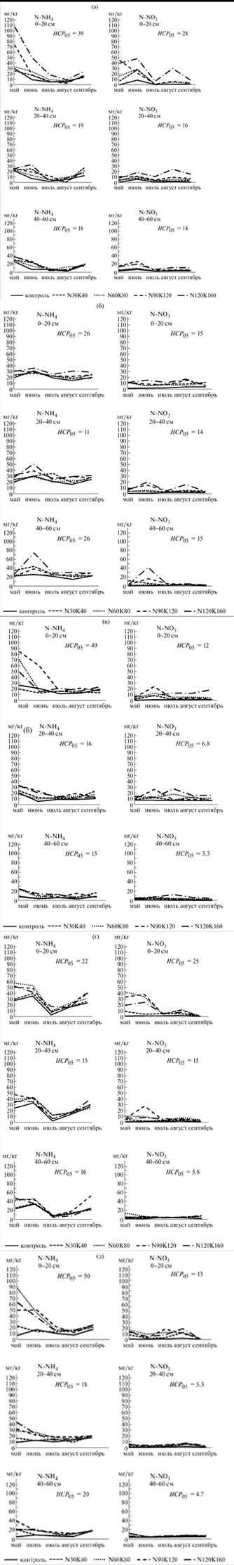 В годы исследования увеличение содержания N-NH4 в слое 0–20 см до высокого уровня (50–107 мг/кг) отмечали в вариантах N60K80, N90K120 и N120K160. Необходимо отметить, что только в засушливых мае и июне 2018 г. максимальное содержание N-NH4 было в варианте с максимальной дозой удобрений N120K160 (рис. 1а), причем количество N-NH4 было достоверно больше, чем в вариантах с более низкими дозами. В остальные годы величины показателя в вариантах N60K80, N90K120 и N120K160 статистически не различались между собой (рис. 1б–д). Такой эффект, вероятно, был связан со значительным увеличением в почве концентрации катиона калия, который может активно конкурировать с катионом аммония за обменные позиции [19], поскольку мочевину и сульфат калия вносили в нашем эксперименте одновременно. Таким образом, в вариантах с высокими дозами удобрений фиксация катиона N-NH4 почвой могла ослабевать, что облегчает его миграцию в нижние слои почвы.