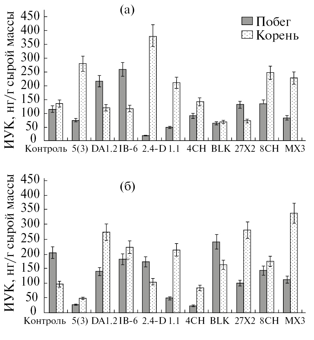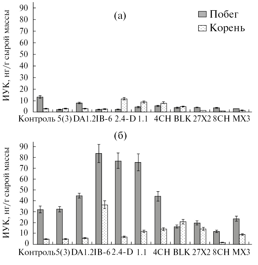 Было определено содержание АБК, ЦК и ИУК в корнях и побегах пшеницы, обработанной различными культурами бактерий в условиях стресса, вызванного почвенной засухой. ИУК – наиболее известный ауксин. Этот гормон контролирует широкий спектр процессов, связанных с ростом и развитием растений, таких как рост и удлинение клеток в апикальных меристемах, колонизацию корней бактериями, дифференцировку сосудистых тканей, защиту от патогенов [13]. При условии оптимального полива штаммы бактерий не способствовали существенному накоплению ИУК (рис. 1а).