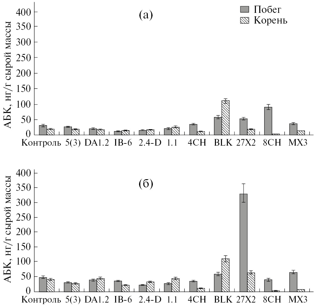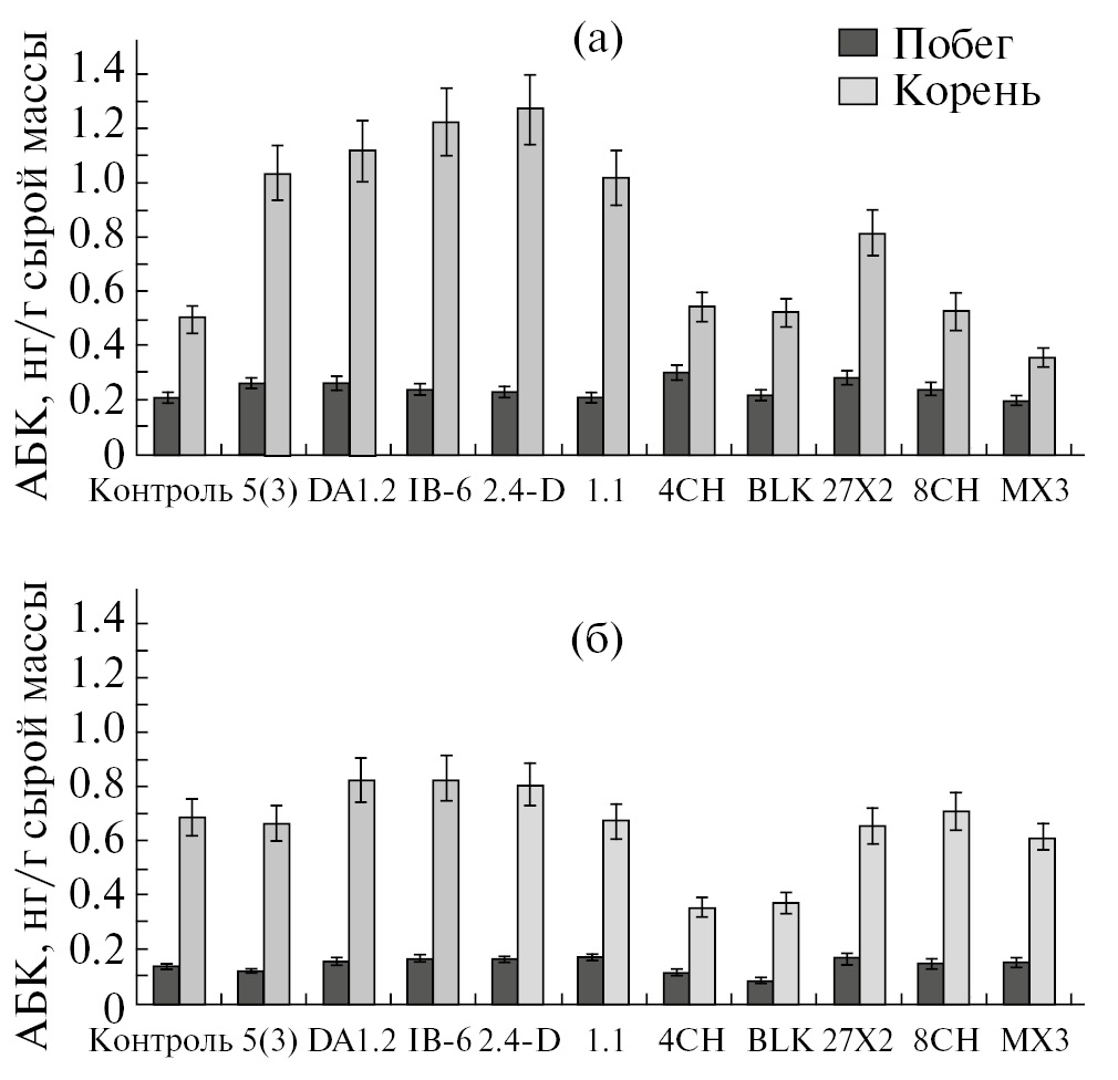 Для вариантов опыта, в которых наблюдали активизацию роста пшеницы, было характерно снижение содержания АБК, равномерно распределенное между корнями и побегами. Ранее было показано, что ростостимулирующие штаммы 2.4-D и DA1.2 способствовали снижению концентрации АБК в тканях растений в условиях стресса [19, 20].