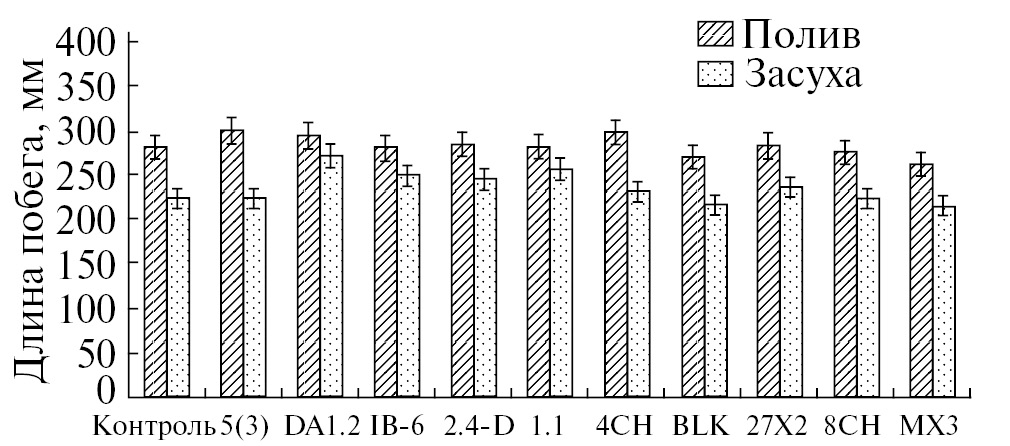 Стимуляция линейного роста побегов при оптимальном увлажнении почвы была обнаружена после обработки штаммами Pseudomonas chlororaphis 4CH и P. protegens DA1.2. На фоне засухи этот показатель превышал контроль при обработке растений штаммами P. chlororaphis IB-6, P. protegens DA1.2, P. plecoglossicida 2.4-D, P. turuhanskensis 1.1.