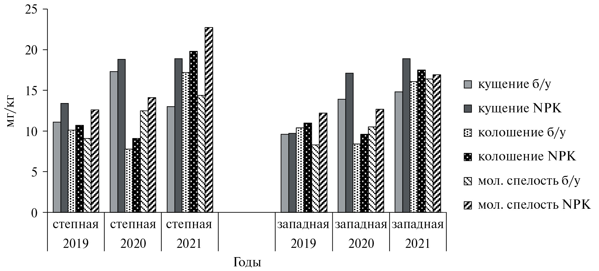 В условиях достаточно увлажненных периодов начала вегетации в 2020 и 2021 годах при активизации процессов нитрификации отмечалось более высокое содержание азота под сортами ячменя. Избыточное увлажнение почвы в апреле 2020 года и последующий оптимальный температурный режим позволили растениям продлить интенсивный вынос питательных веществ до колошения. К этой фазе под растениями отмечалось минимальное количество азота: 7.8–9.1 мг/кг под степными сортами и 8.4–9.6 мг/кг под западными. Достаточное увлажнение почвы в 2021 году, но пониженные температуры воздуха до фазы колошения снизили потребление азота по сравнению с 2020 годом.