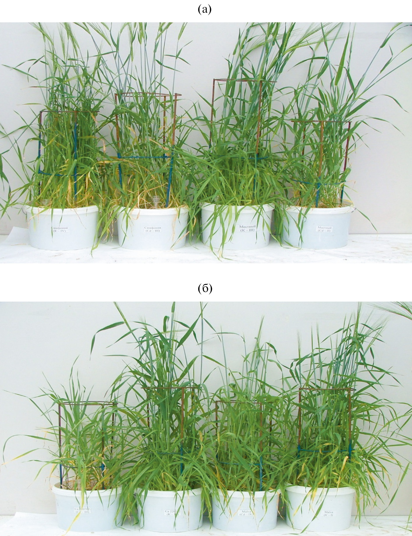 Рис. 1. Внешний вид растений ячменя на 50-е сут эксперимента: (а) – устойчивые сорта, слева направо: сорт Симфония (контроль), сорт Симфония (50 мг Cd2+/кг), сорт Местный (контроль), сорт Местный (50 мг Cd2+/кг), (б) – чувствительные сорта, слева направо: сорт Са 220702 (50 мг Cd2+/кг), сорт Са 220702 (контроль), сорт Malva (50 мг Cd2+/кг), сорт Malva (контроль).