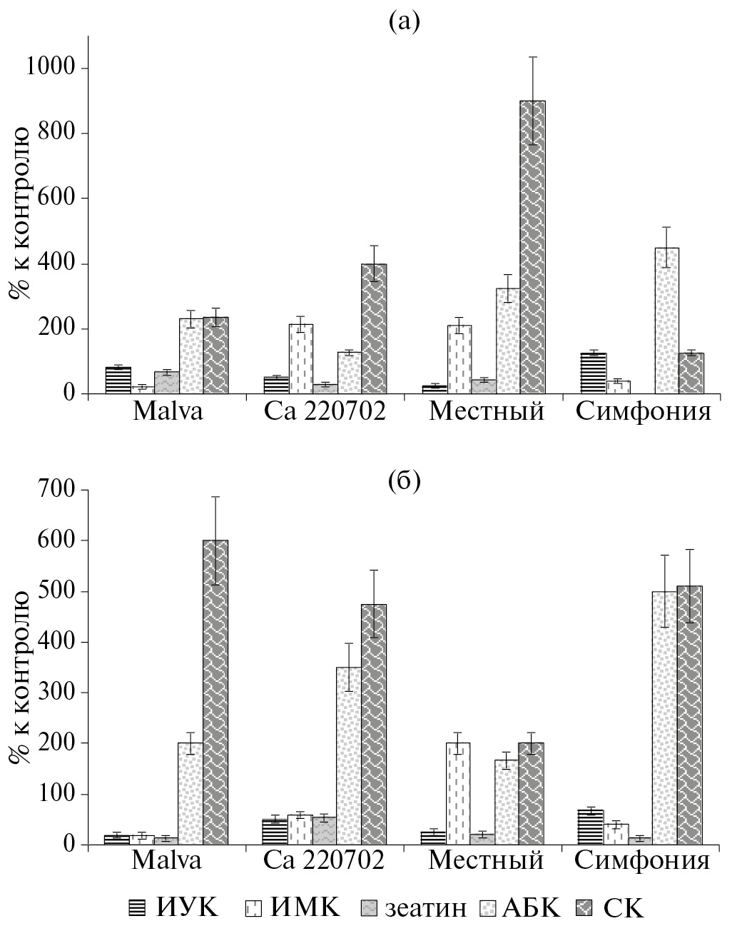 На 30-е сут эксперимента наиболее сильно снижались концентрации ауксина ИМК у сорта Маlva (рис. 4а). Кроме того, пониженный синтез ИМК демонстрировал и устойчивый сорт Симфония. У остальных сортов значимых отличий от контроля в содержании ИМК не выявлено. На 50-е сут эксперимента концентрации ИМК были снижены у сорта Маlva и сорта Симфония (рис. 4б). В случае сортов Маlva и Симфония уровни ИМК в анализированных образцах в целом были существенно меньше по сравнению с ИУК, особенно ярко это прослежено на 30-е сут онтогенеза. Эти результаты согласуются с литературными данными о том, что содержание ИУК составляет ≈80–95% всех ауксинов растений [27]. Остальные натуральные ауксины присутствуют в растениях в меньших количествах. Впрочем, у сортов Са 220702 и Местный наблюдали обратный эффект. На 50-е сут у сорта Местный содержание ИМК оказалось значимо больше, чем ИУК, но у других сортов содержание этих 2-х гормонов было сходным.