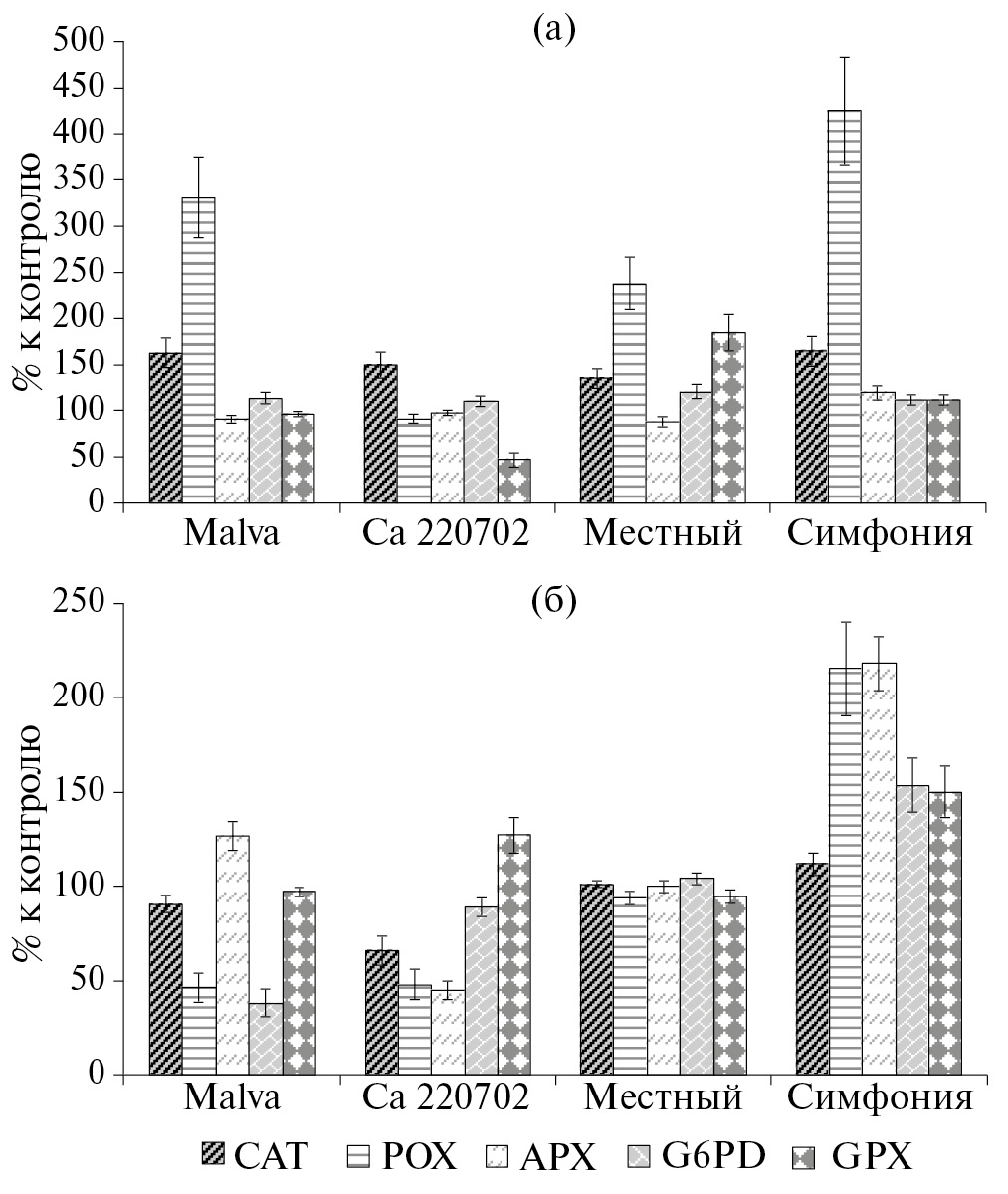 Активность APX так же, как и активность CAT и POX, статистически значимо снижалась в растениях чувствительного сорта Са 220702 (р = 0.049) на 50-е сут эксперимента. В то же время у устойчивого сорта Симфония она значимо возрастала. Обнаружено, что на 30-е сут активность GPX несколько возрастала у устойчивого сорта Местный, а на 50-е сут она была достаточно высокой у устойчивого сорта Симфония. Повышенной она оказалась и у чувствительного сорта Са 220702.