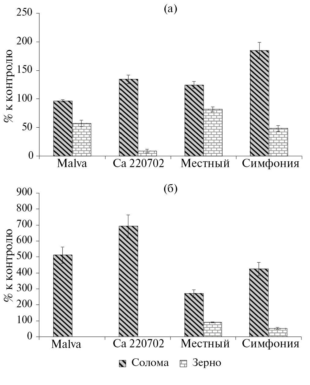 Более информативным оказался вариант с внесением кадмия 50 мг/кг (рис. 6б). В этом случае угнетение развития чувствительных сортов было выражено заметно отчетливее. Устойчивые сорта тоже демонстрировали уменьшение рассмотренных показателей, но в меньшей степени. Наиболее отчетливые различия отмечены для массы зерна. Для чувствительных сортов она составила 22 и 33% от контроля, в то время как для устойчивых – 52 и 73%, при этом наиболее чувствительным оказался сорт Са 220702, а самым устойчивым – Симфония (разница между ними была более чем в 3 раза). По массе соломы различия между группами контрастных сортов тоже отмечали, но менее заметные. Величина показателя у обоих чувствительных сортов менялась в пределах ошибки (49 и 54%), величина параметра у устойчивого сорта Симфония также укладывалась в этот диапазон (53.6%). И только сорт Местный существенно превосходил остальные (82%). Масса 1000 зерен оказалась наименее информативным показателем, и изменения его величины были несущественными. Сорт Местный имел наибольшую величину этого показателя (117%), однако она значимо не отличалась от таковой у чувствительного сорта Malva (111%).