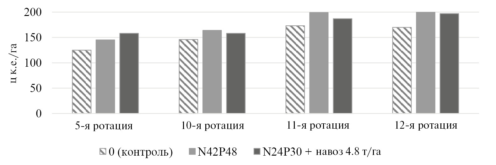 Рис. 1. Влияние длительного внесения удобрений на продуктивность зерно-соевого полевого севооборота, к.е. ц/га