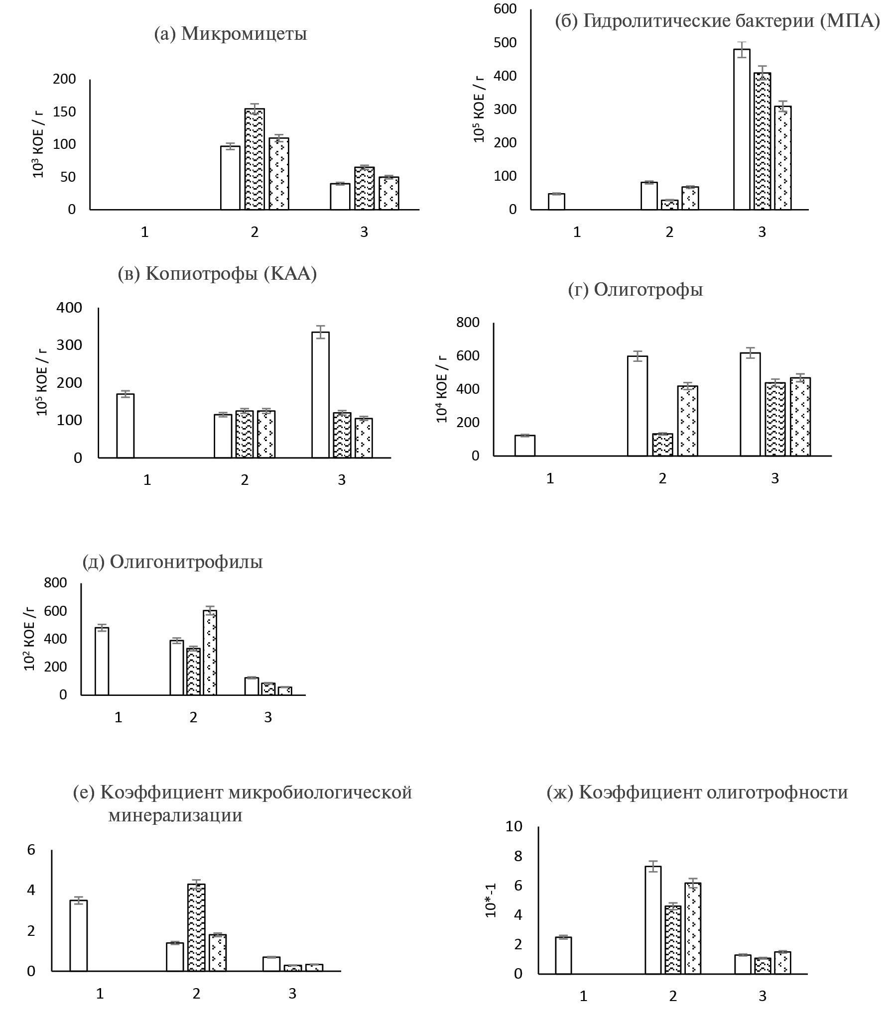 Рис. 2. Численность микроорганизмов в ризосфере картофеля в начале вегетации (1), в фазе бутонизации (2) и в фазе созревании урожая (3): (а) –микромицеты, (б) – гидролитики, (в) – копиотрофы, (г) – олиготрофы, (д) – олигонитрофилы, (е) – коэффициент микробиологической минерализации, (ж) – коэффициент олиготрофности.