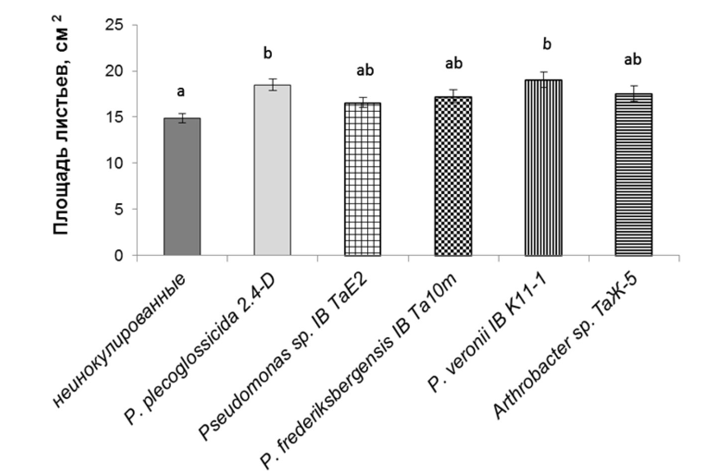Конкурентные отношения между растениями в плотных посадках предполагают ростовой ответ листьев, направленный на захват солнечной энергии, которая в загущенных посевах становится лимитирующим фактором [26]. Возможно поэтому поддержание роста растений в плотных посевах в результате обработки их бактериями-деструкторами АБК не должно ограничиваться увеличением массы побега или корня. В этой связи проанализировали формирование площади листовой поверхности растений пшеницы после инокуляции разными бактериями (рис. 5).