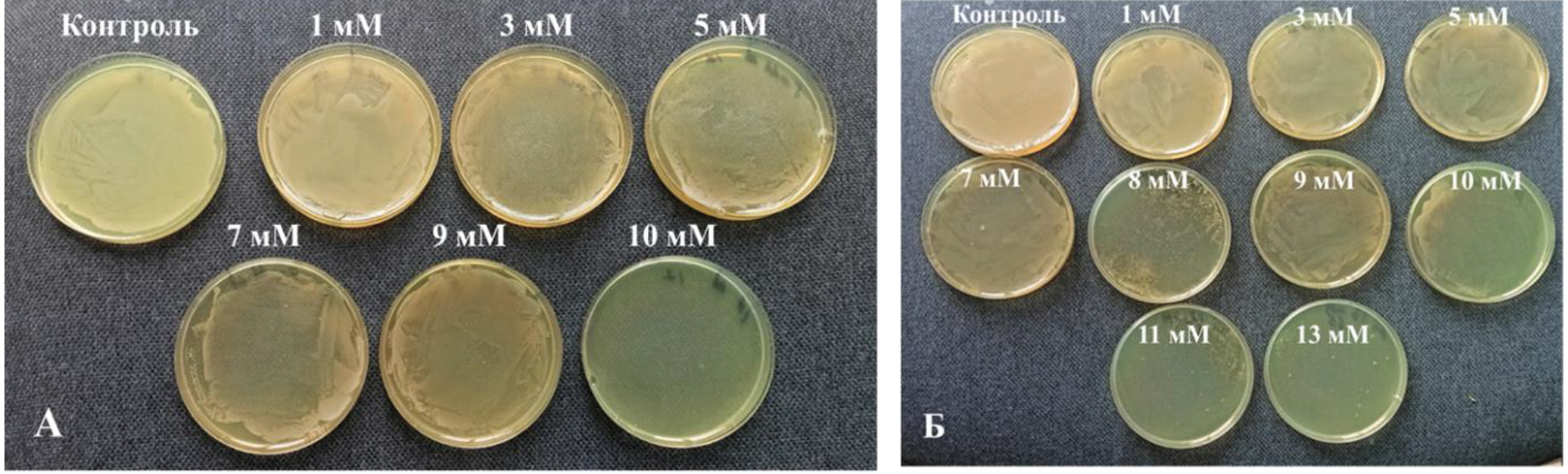 Рис. 3. Рост штаммов Pseudomonas sp. 65 HM (а) и 67 HM (б) на среде с добавлением NiCl2.