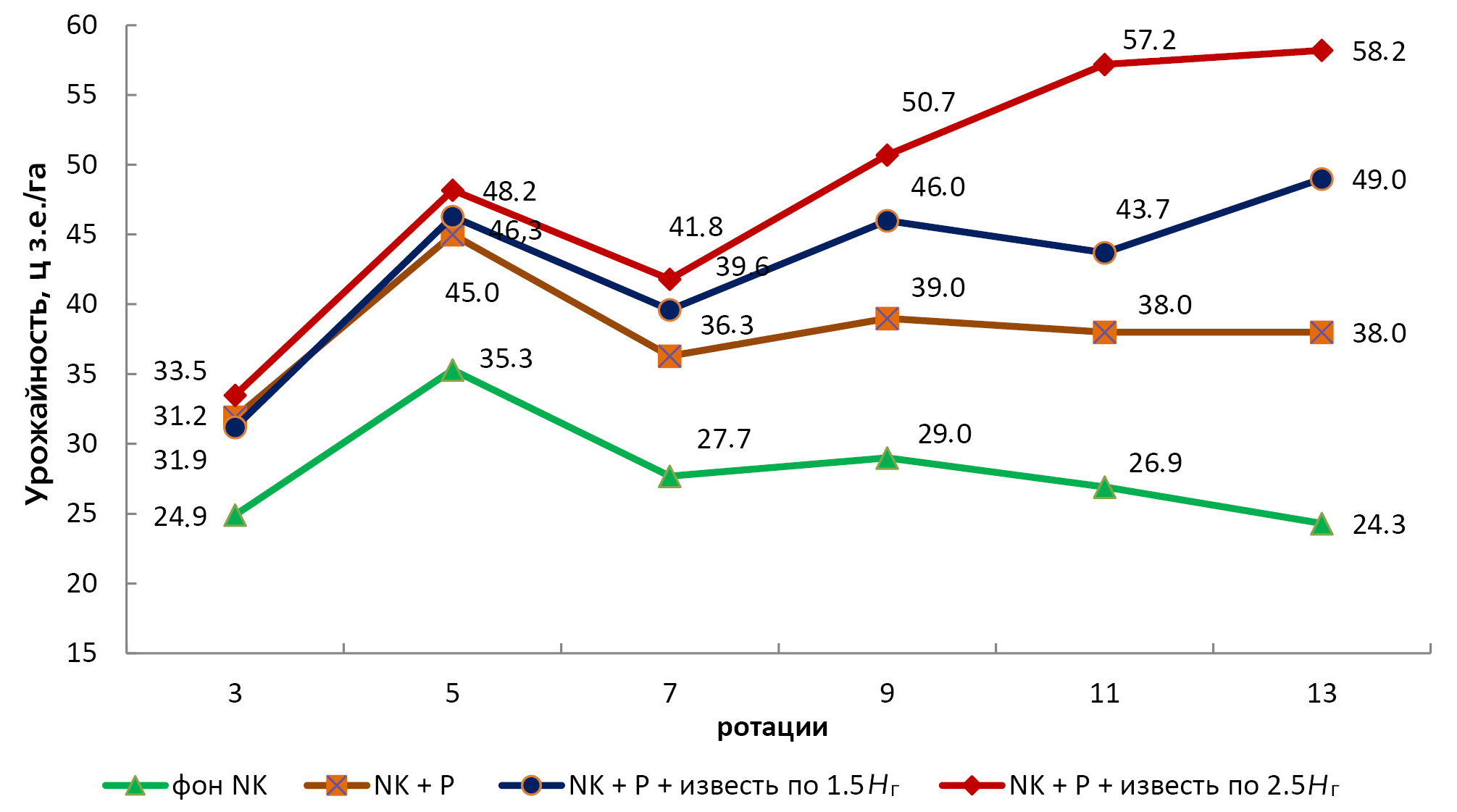 Наоборот, в 10–13-й ротациях наметилась тенденция к снижению продуктивности зерновых культур вследствие подкисления почвы физиологически кислыми азотными и калийными удобрениями, а также из-за значительного возрастания содержания подвижного алюминия >120 мг/кг почвы. Внесение фосфорных удобрений на азотно-калийном фоне способствовало стабилизации урожайности в последние годы на уровне 38–39 ц зерна/га. При внесении извести в дозе по 1.5 и 2.5 Нг прибавка от фосфорных удобрений увеличивалась на 11 и 20 ц/га или на 29–53%.