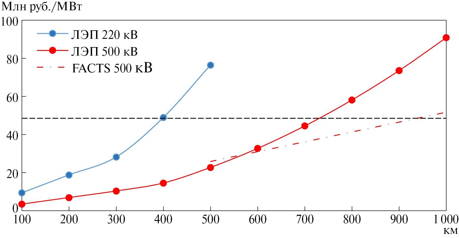 Данные рекомендации могут быть скорректированы с учетом применения некапиталоемких средств повышения пропускной способности ЛЭП. Известно, что современные средства регулирования потоков мощности (фазоповоротные устройства, управляемые средства компенсации реактивной мощности и др.), совместно именуемые в литературе гибкими системами передачи переменного тока (FACTS), позволяют значительно повысить пропускную способность дальних ЛЭП вплоть до допустимой токовой загрузки. При этом коэффициент удорожания таких ЛЭП за счет установки соответствующих устройств, сооружения для них промежуточных подстанций и переключательных пунктов, на основе данных [14] можно оценить в 1.5. Тогда зависимость УКВ на единицу пропускной способности дальних ЛЭП 500 кВ с FACTS будет иметь вид, обозначенный на рис. 1 красным штрих-пунктиром.