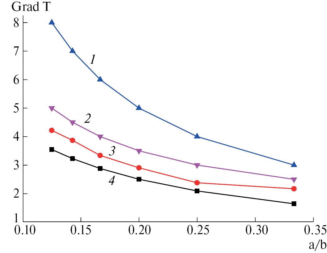 Также полученные результаты показывают, что вытянутые в изотермическом направлении включения имеют более высокий градиент температуры внутри, чем включения формой, ближе к квадратной. Значения градиента температуры, полученные по формуле (4), где градиент температуры внутри включения не зависит от соотношения сторон, на рис. 2. не представлены, т. к. они существенно далеки от приведенных.