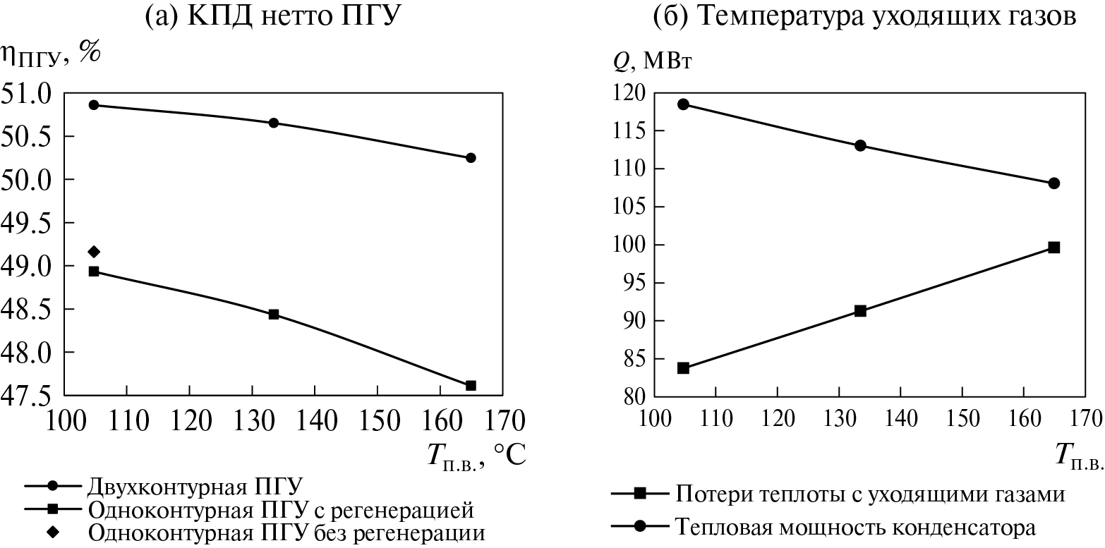 Результаты термодинамического анализа показали, что добавление подогревателей низкого давления в паротурбинной части приводит к возрастанию температуры питательной воды и, как следствие, температуры уходящих газов, что обуславливает падение эффективности парогазового цикла. На рис. 3 приведены графики зависимости эффективности ПГУ и температуры уходящих газов Tух. от температуры питательной воды Тп.в. для одноконтурной установки без регенерации, с регенерацией и двухконтурной установки. Изменение температуры питательной воды производилось за счет изменения давления в деаэраторе (использовался ряд давлений для деаэраторов – 0.12, 0.3 и 0.7 МПа). Увеличение температуры питательной воды на 60°C приводит к уменьшению эффективности цикла на 2.3% в цикле с регенерацией и на 0.6% при применении двухконтурной ПГУ (рис. Рис 3а). Добавление в одноконтурную установку подогревателей низкого давления приводит к падению общей эффективности цикла ввиду повышенных потерь с теплотой уходящих газов. Эффективность двухконтурной установки в среднем на 1.7–1.1% выше, чем одноконтурной, в первую очередь за счет более глубокой утилизации теплоты уходящих газов. Одновременно с этим увеличение температуры питательной воды на 60°C в одноконтурной установке приводит к росту потерь теплоты с уходящими газами на 15.7 МВт и сокращению потерь в конденсаторе паровой турбины на 10.4 МВт (рис. 3б).