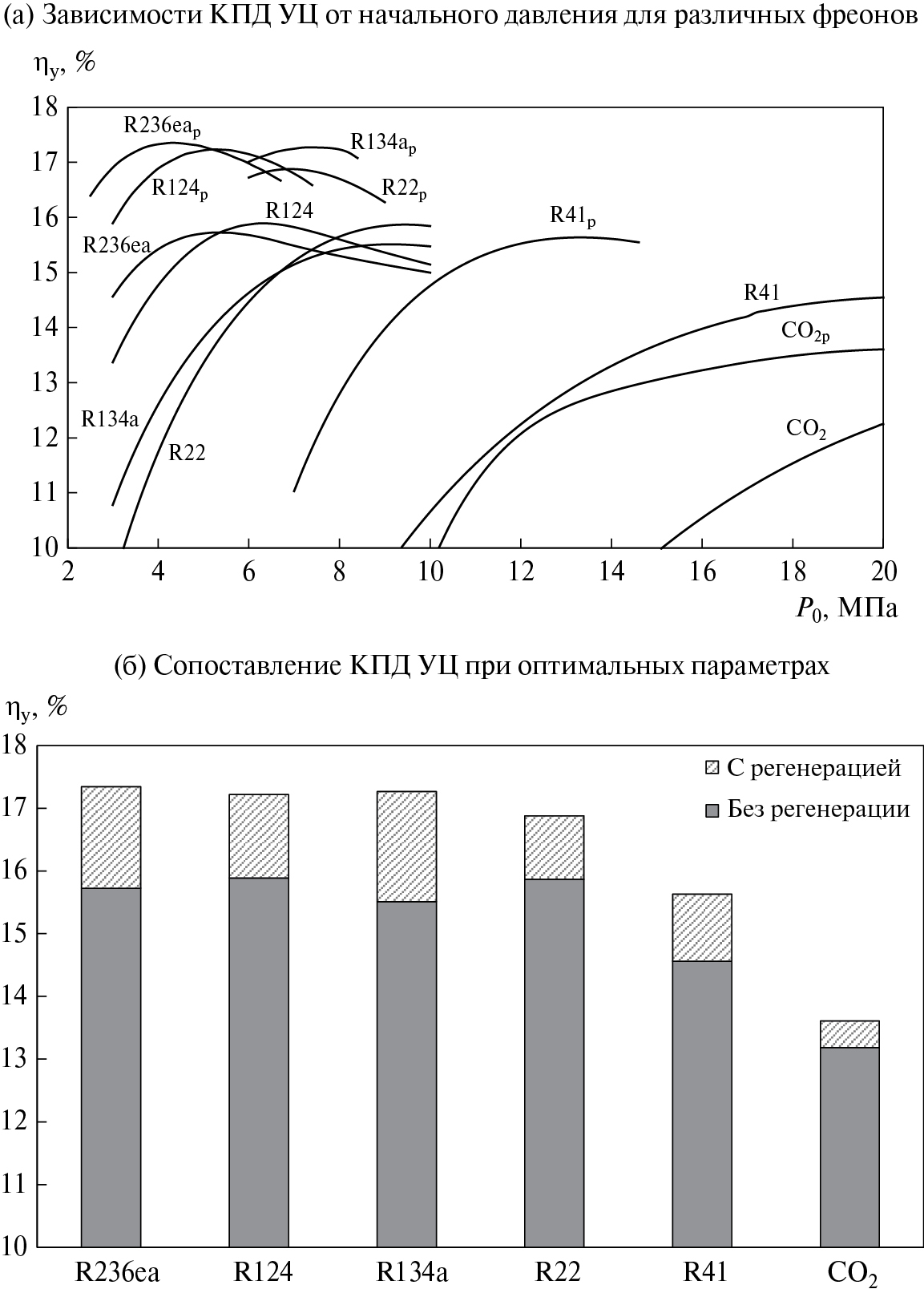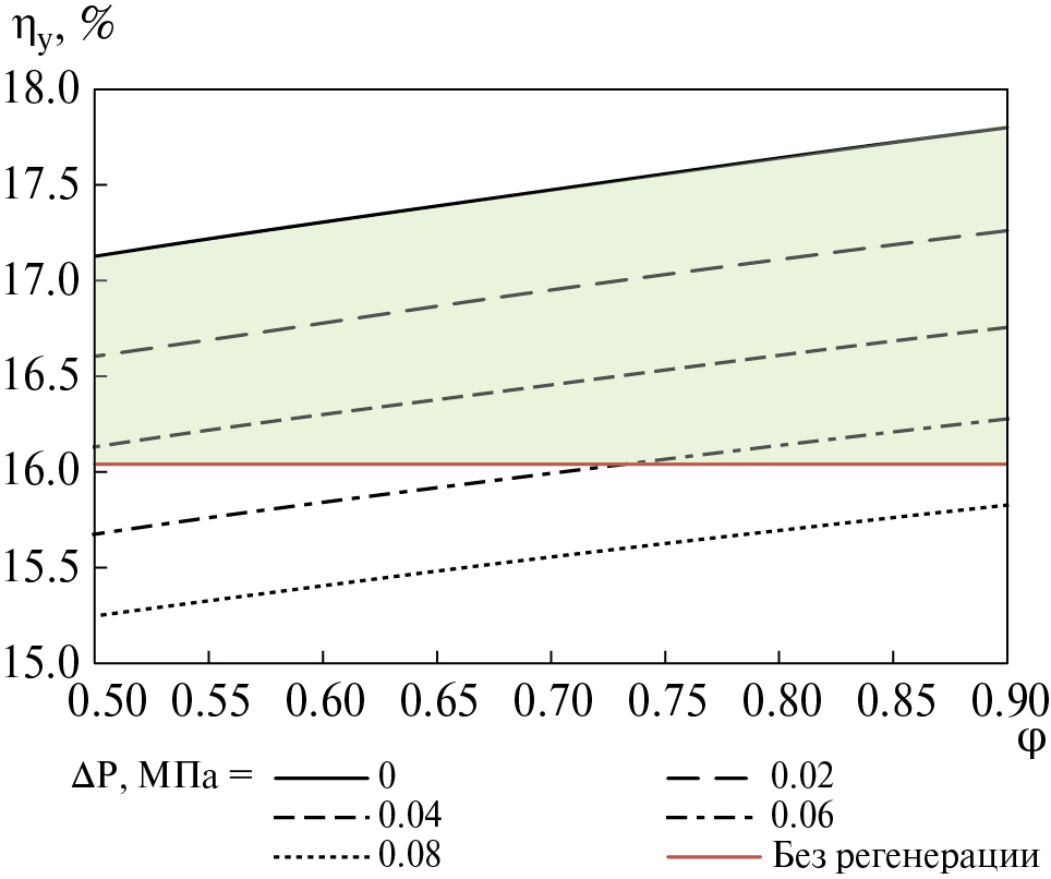 На рис. 8 приведены графики зависимости КПД нетто ОЦР на фреоне R236ea от степени регенерации в цикле и потерь давления в регенераторе. Степень регенерации и потери давления существенно влияют на конечное значение КПД органического цикла. Так, при увеличении потерь давления в регенераторе на 10 кПа эффективность органического цикла снижается на 0.25%, а при увеличении степени регенерации на 10% эффективность цикла увеличивается в среднем на 0.2%.