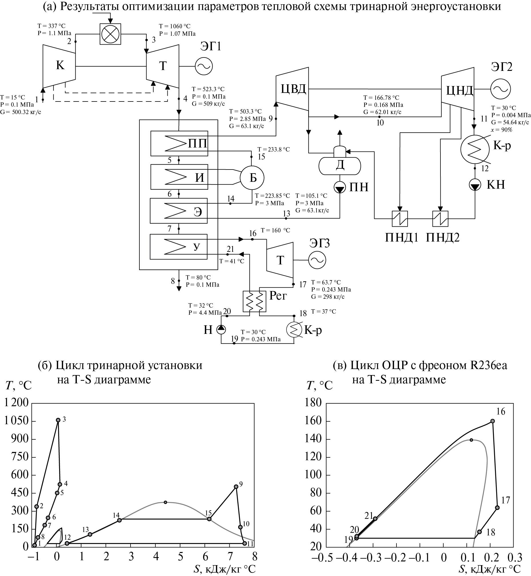 Таким образом, наиболее эффективным схемным решением будет использование в качестве утилизационной установки для тринарного энергоблока ОЦР на фреоне R236ea. Итоговая схема и параметры тринарной энергоустановки, а также T-S диаграмма тринарного цикла приведены на рис. 5.