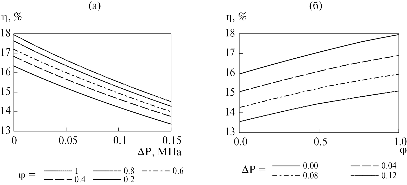 Рис. 8. График зависимости КПД нетто ОЦР от потерь давления в регенераторе (а) и степени регенерации (б)